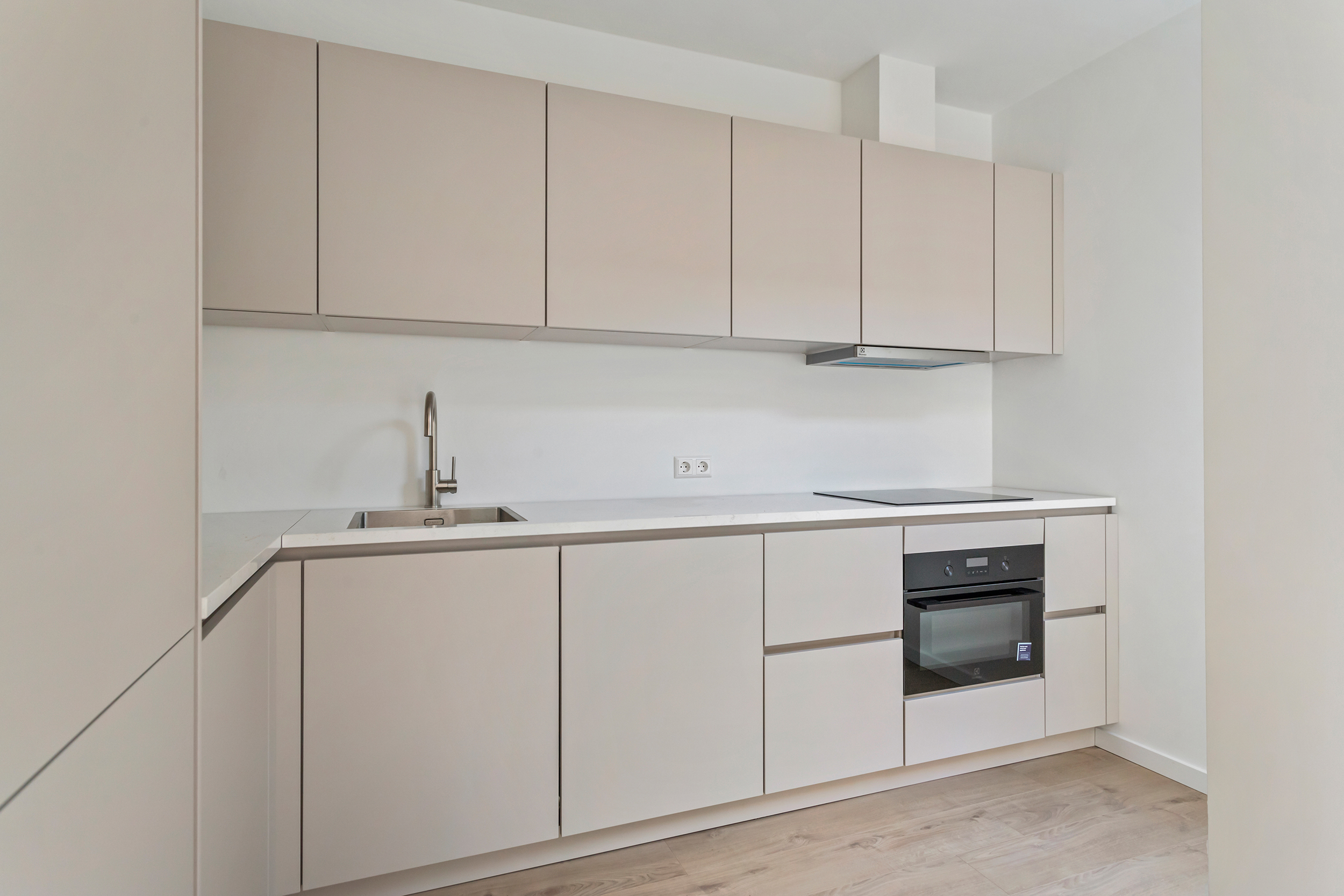 De keuken is aan de achterzijde gelegen en is een absolute blikvanger met een moderne uitstraling en strakke afwerking. Het greeploze design in zachte tinten combineert perfect met het lichte werkblad en zorgt voor een rustige, stijlvolle basis. Dankzij de praktische indeling is er volop werk- en opbergruimte.