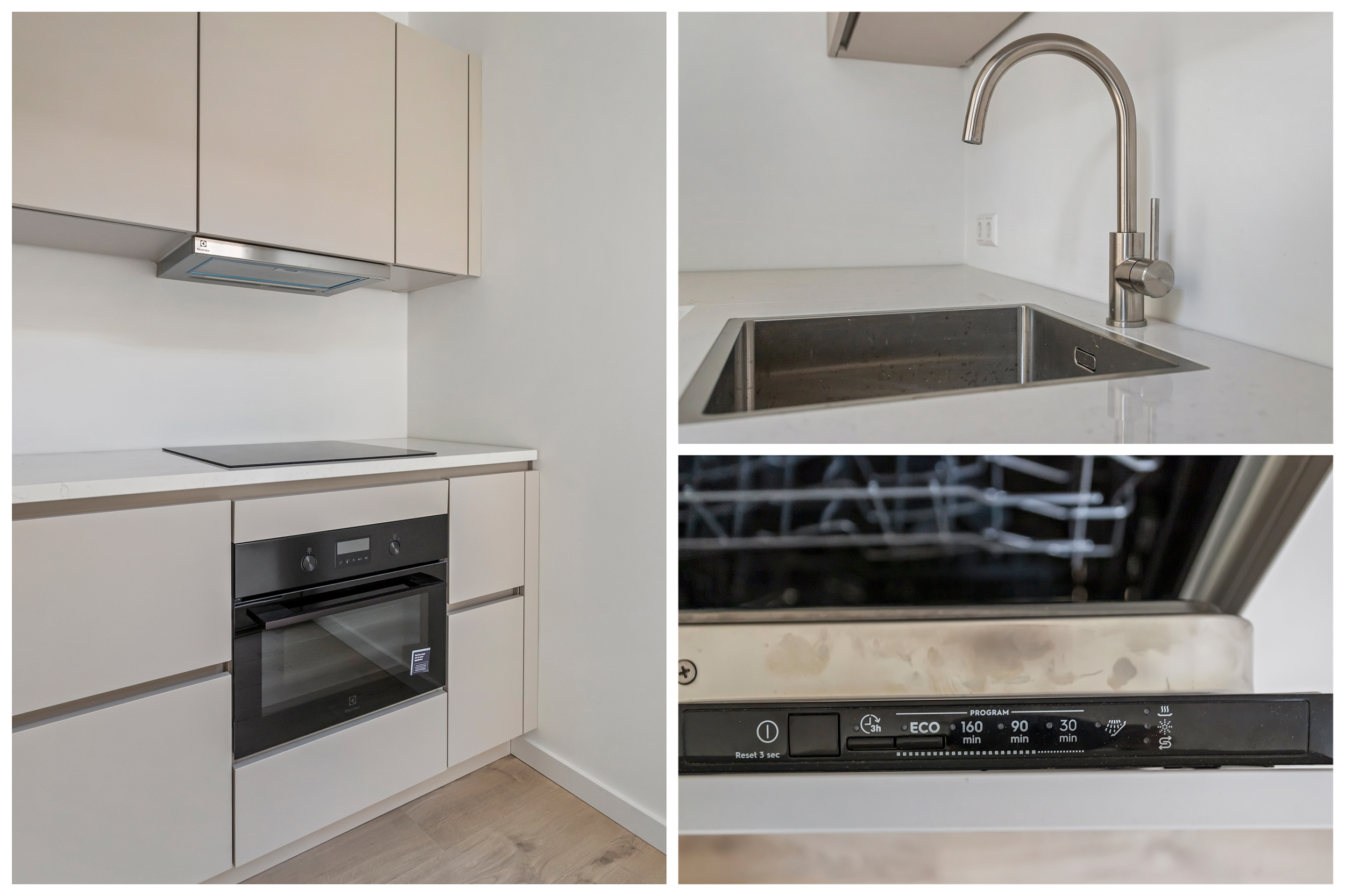 De keuken is voorzien van diverse inbouwapparatuur, waaronder een inductiekookplaat, oven, koelkast, vriezer, vaatwasser en afzuigkap. Alles is gloednieuw en klaar om de eerste gerechten in te bereiden.
