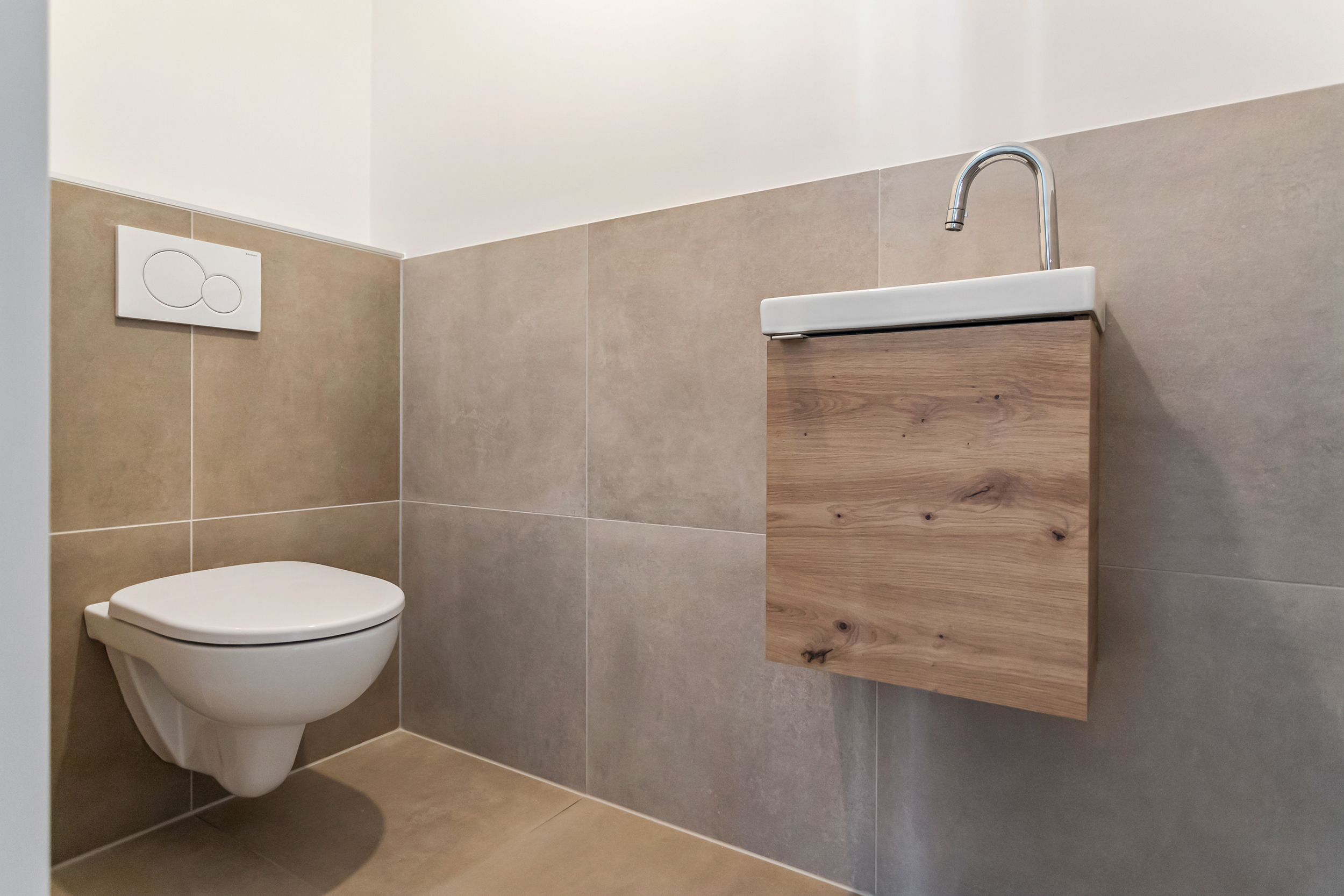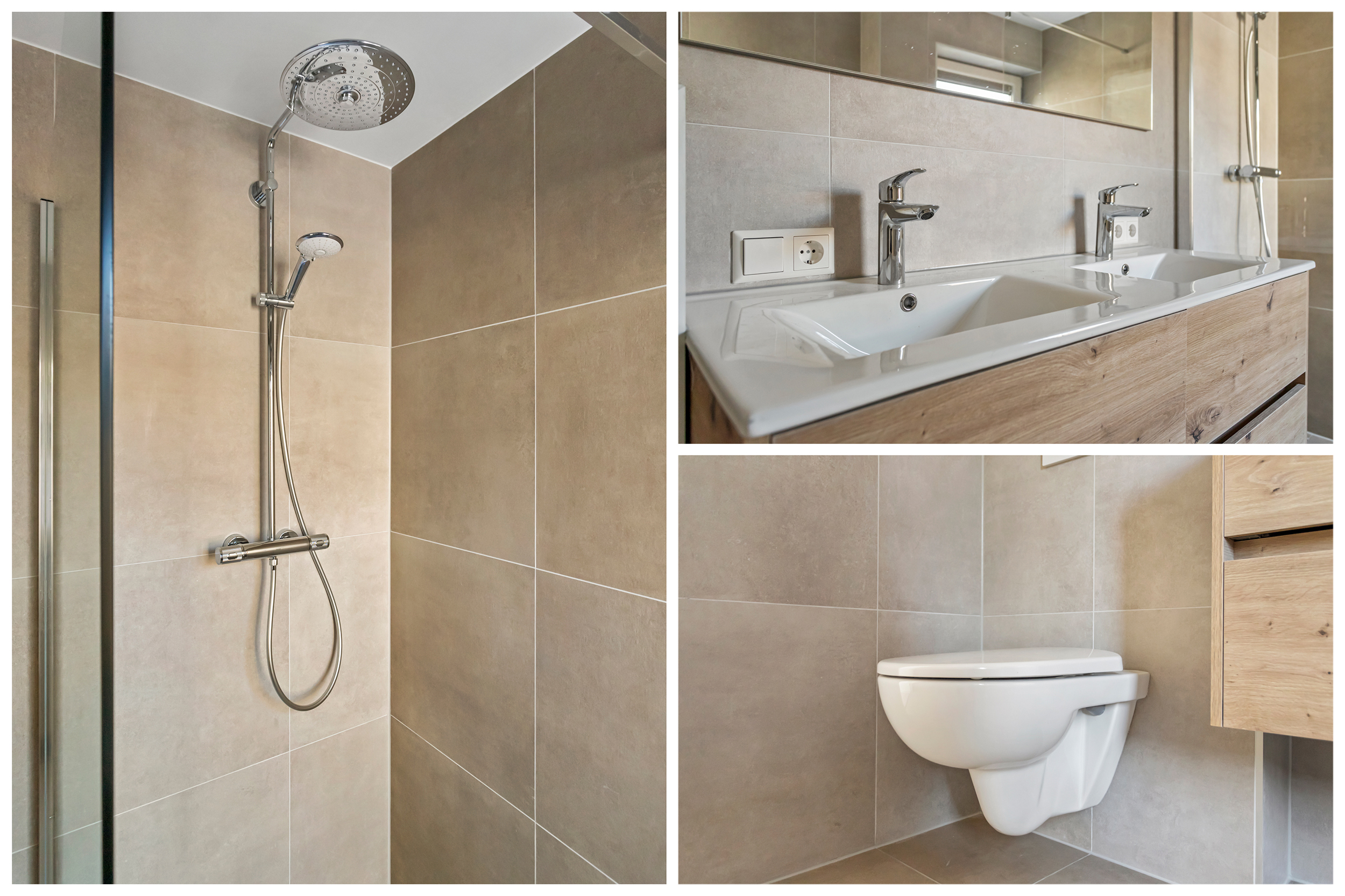 De badkamer is fris en modern ingericht met grootformaat tegels in rustige tinten. De ruime inloopdouche met regendouche nodigt uit tot een ontspannen start van de dag. Het dubbele wastafelmeubel met houtaccent en grote spiegel, samen met het zwevende toilet, maken de ruimte compleet.