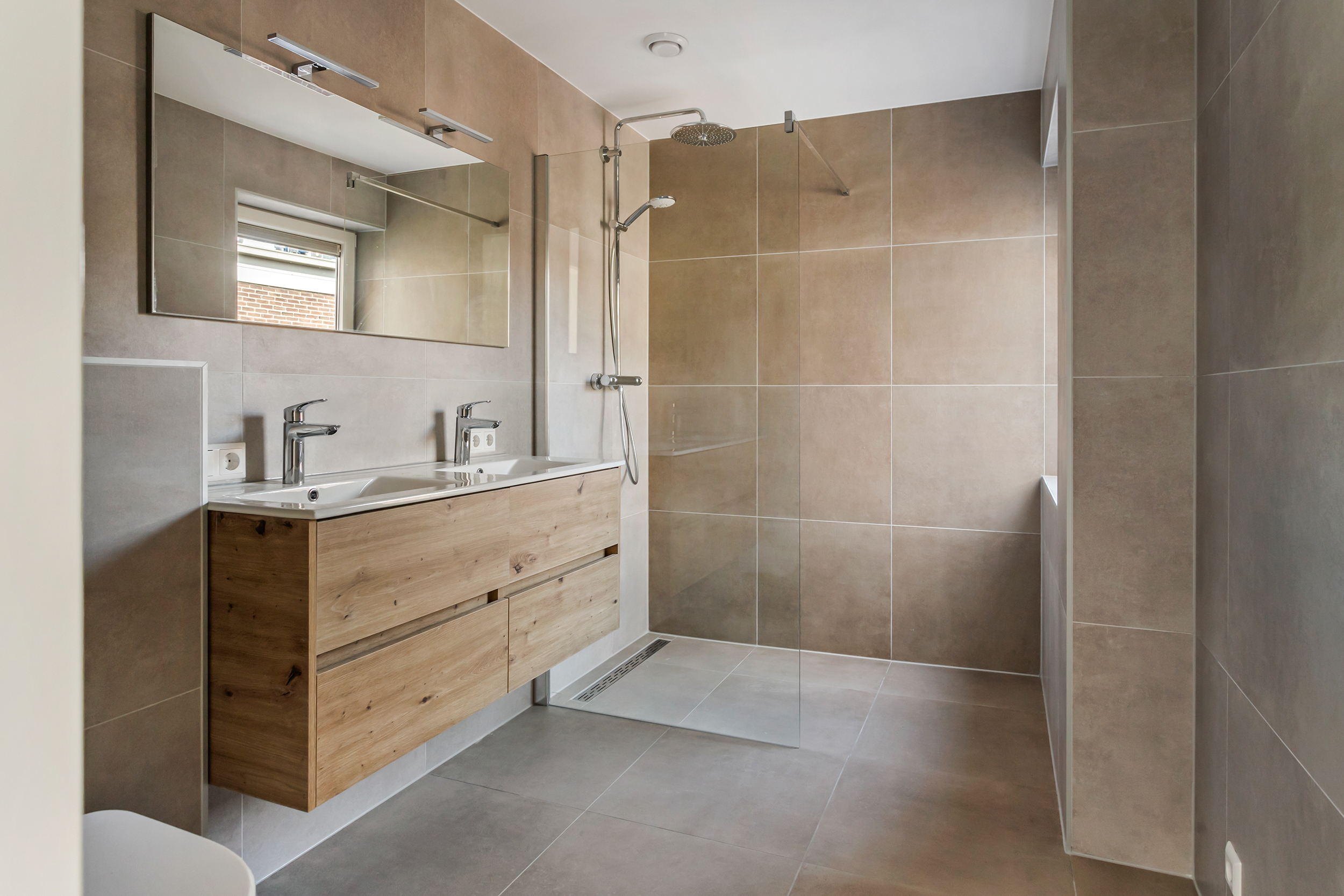 – Moderne badkamer met grootformaat tegels, inloopdouche met regendouche, dubbel wastafelmeubel met houtaccent, grote spiegel en zwevend toilet;