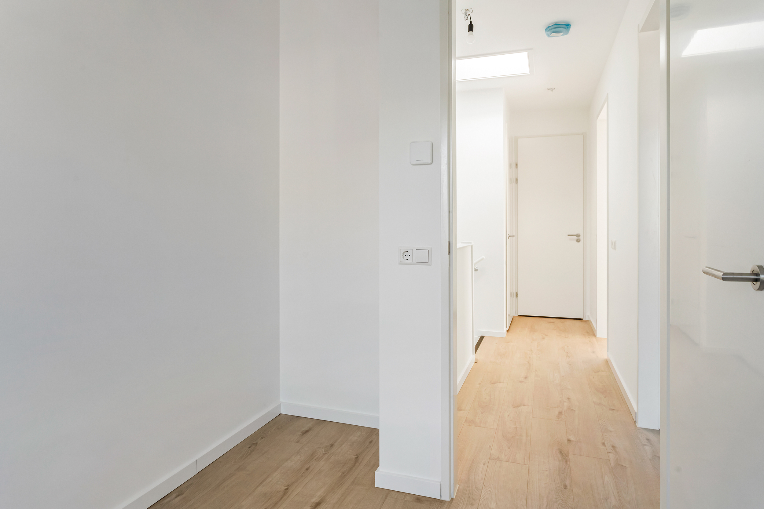 De overloop leidt naar het toilet, de trap naar de tweede etage en de royale leefruimte van de woning. Hier gaat het hart sneller kloppen: het strakke afwerkingsniveau en de overvloed aan daglicht die via de vele raampartijen binnenvalt, maken meteen indruk. De ruimte biedt meer dan genoeg plek voor zowel een sfeervolle zithoek als een royale eettafel – perfect voor borrels en diners met vrienden of familie. Aan de achterzijde bevinden zich grote openslaande deuren naar het zonnige balkon. Zodra deze in de zomermaanden openstaan, ontstaat het heerlijke binnen-buitengevoel.