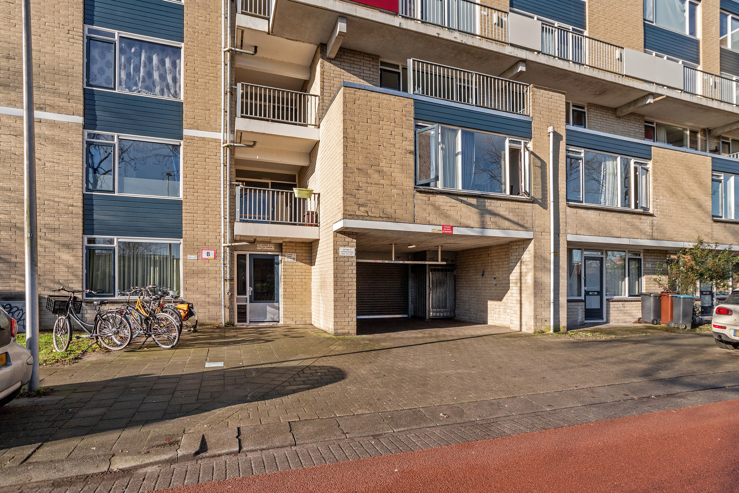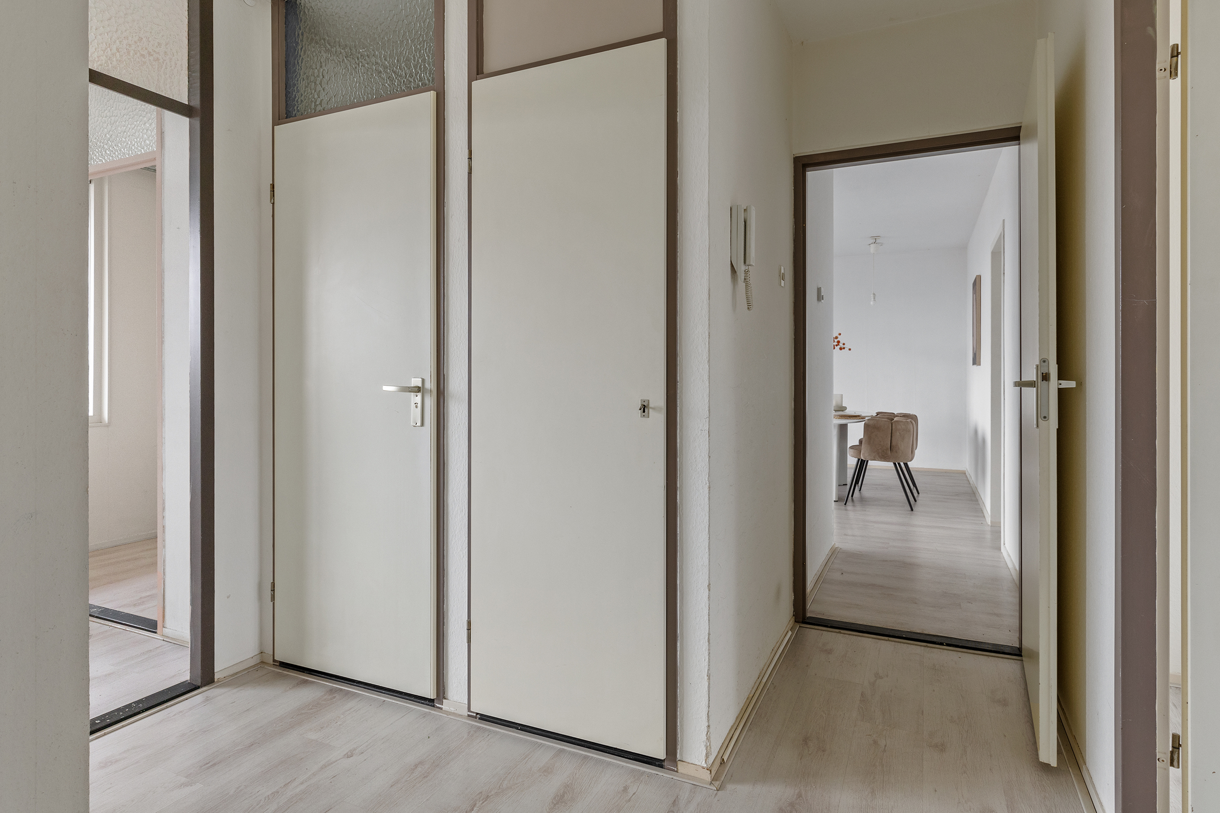 Gemeenschappelijke entree met brievenbussen en bellentableau, toegang tot trappenhuis en bergingen in de onderbouw.