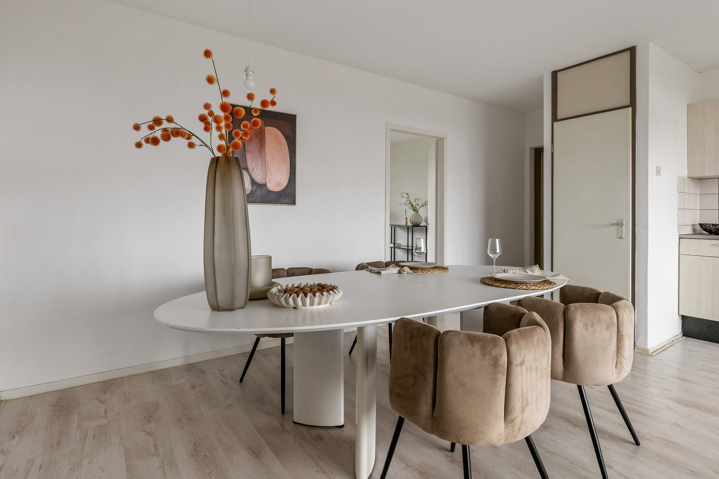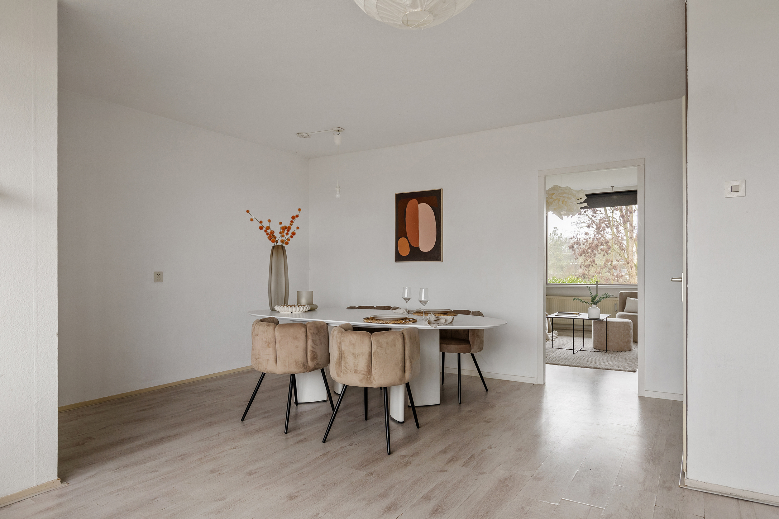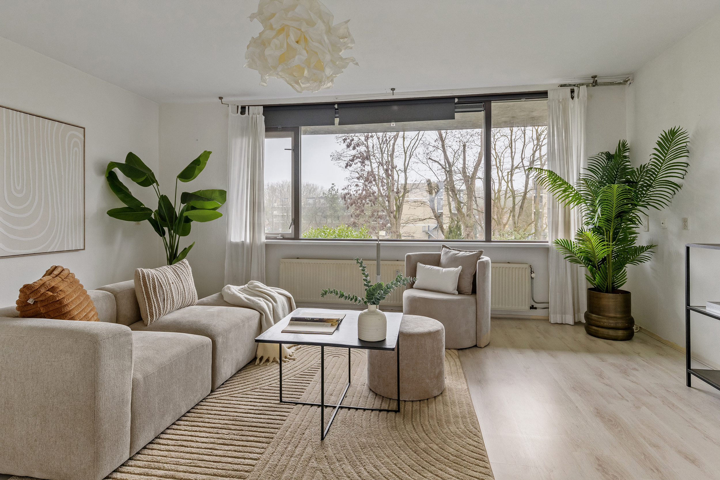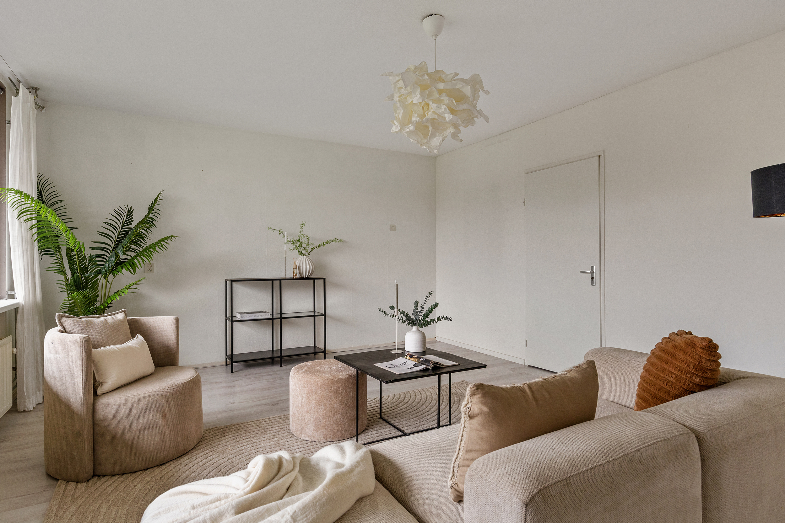 Achter de keuken bevindt zich de woonkamer van maar liefst 25 m², eveneens een aangenaam lichte ruimte. Dankzij het fijne formaat is er volop plek voor een ruime zithoek met een grote bank en extra fauteuils. Hier creëer je moeiteloos een comfortabele en sfeervolle leefruimte waar je echt kunt ontspannen.