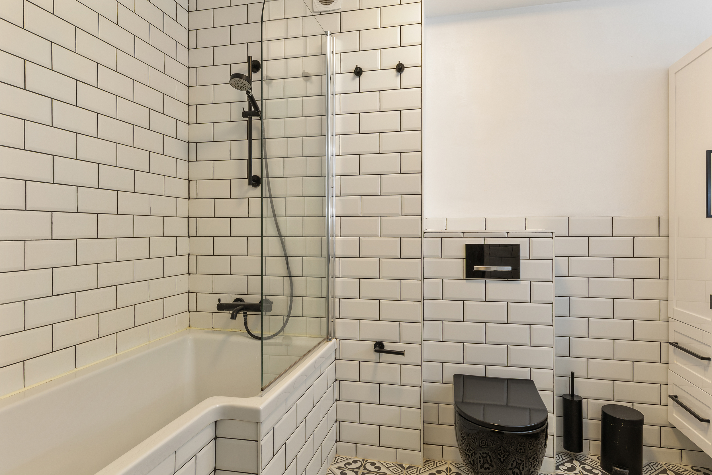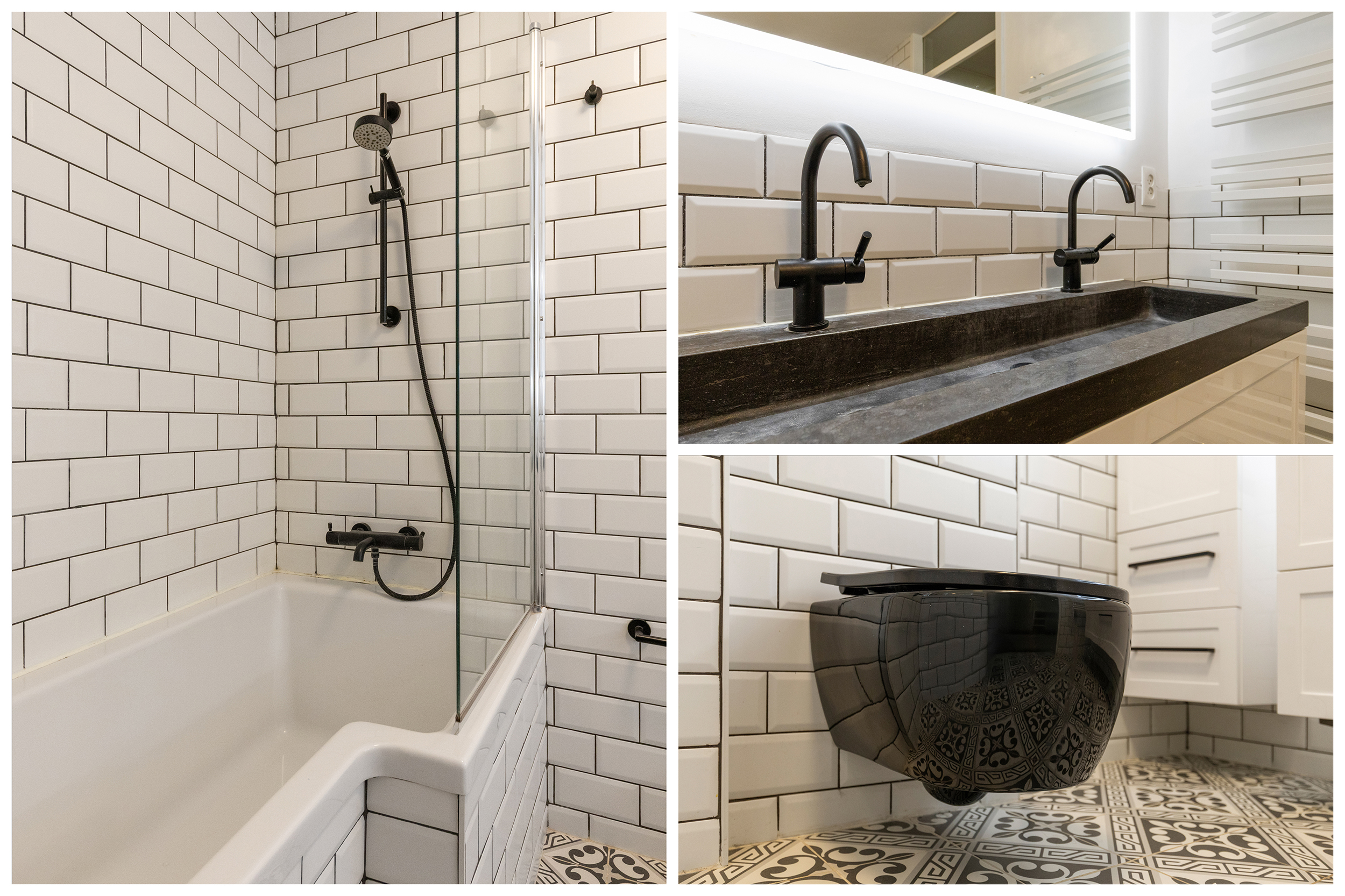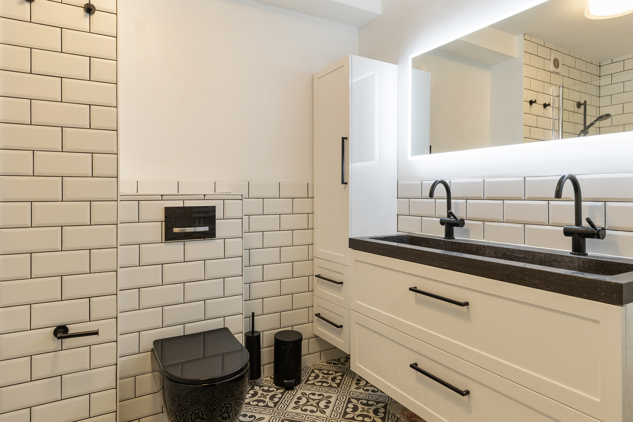 De badkamer is een echte eyecatcher: strak uitgevoerd met witte wandtegels, een stijlvolle tegelvloer en zwarte accenten. De ruimte is voorzien van een ligbad met douche, een dubbele wastafel met meubel en een zwevend toilet. Dankzij de doordachte indeling en het gebruik van kwalitatieve materialen is dit een comfortabele en eigentijdse ruimte waar elke dag goed begint.