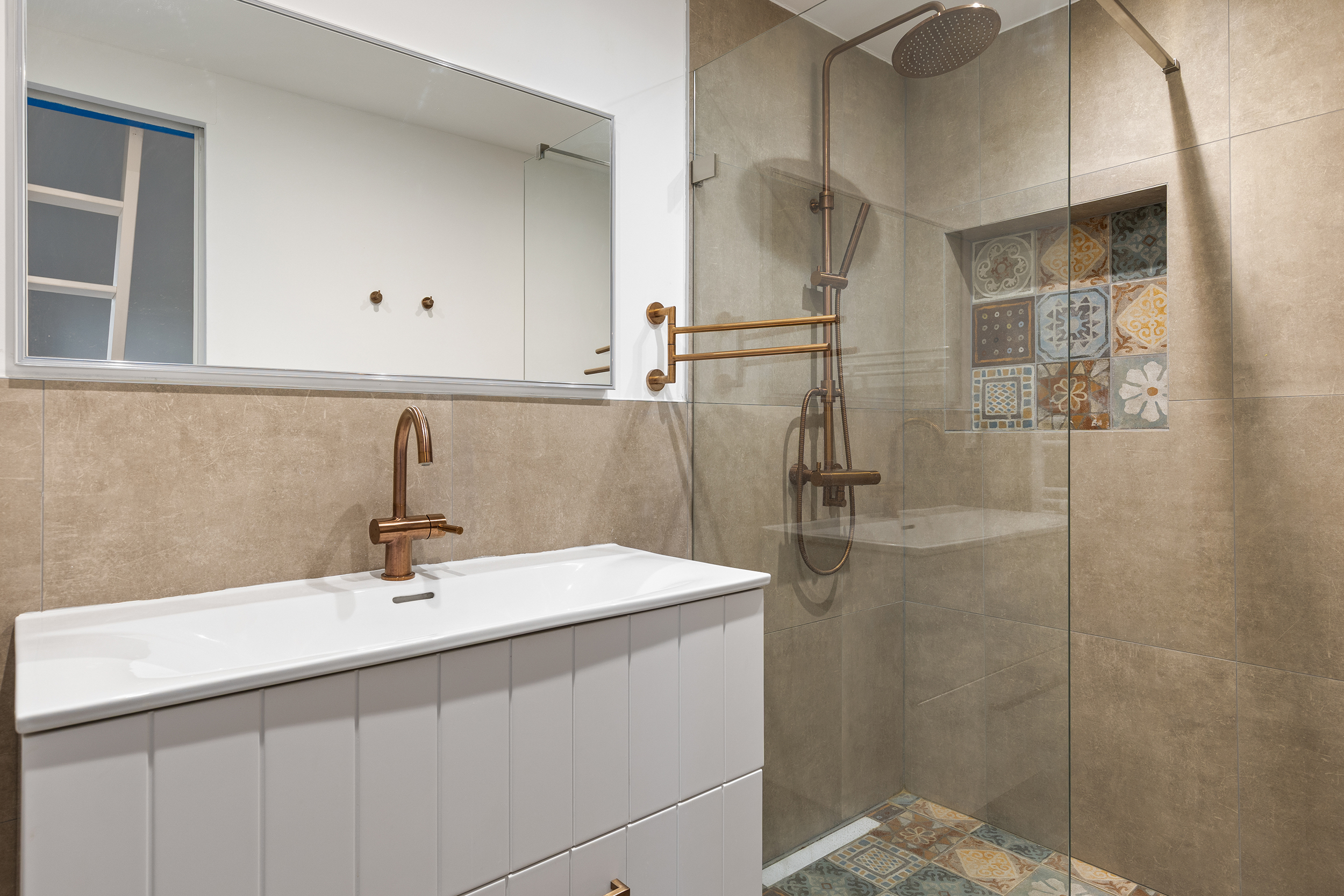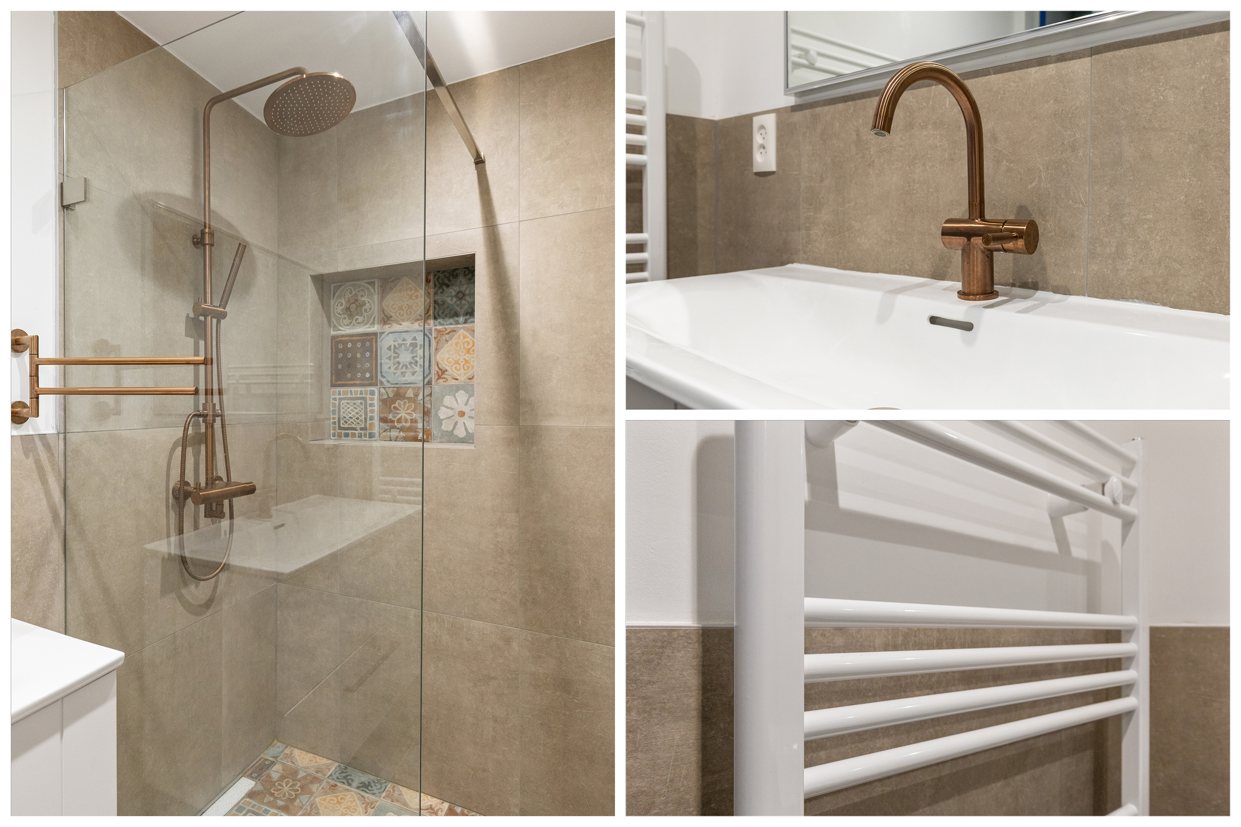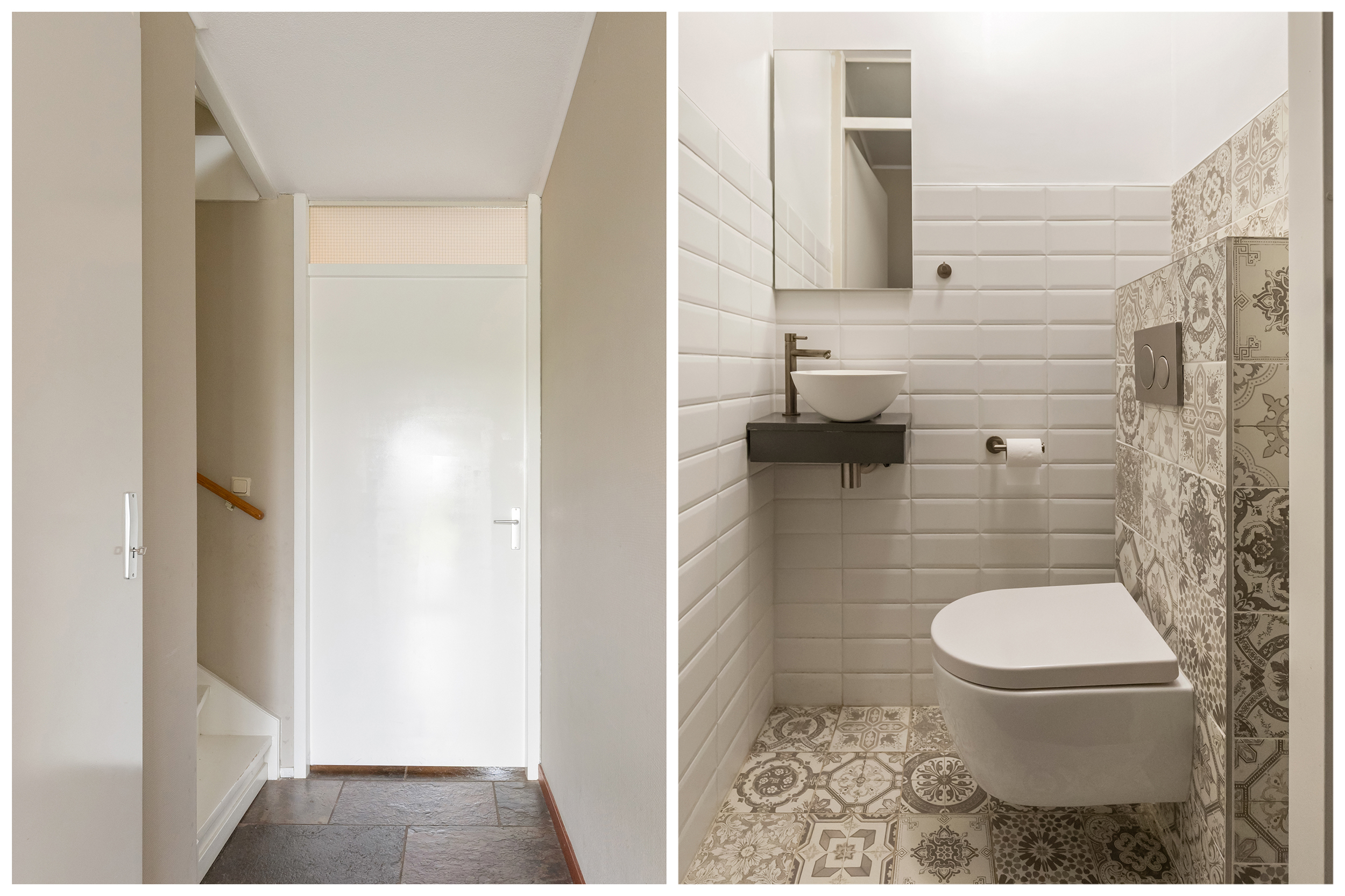 De badkamer is een echte eyecatcher: strak uitgevoerd met witte wandtegels, een stijlvolle tegelvloer en zwarte accenten. De ruimte is voorzien van een ligbad met douche, een dubbele wastafel met meubel en een zwevend toilet. Dankzij de doordachte indeling en het gebruik van kwalitatieve materialen is dit een comfortabele en eigentijdse ruimte waar elke dag goed begint.