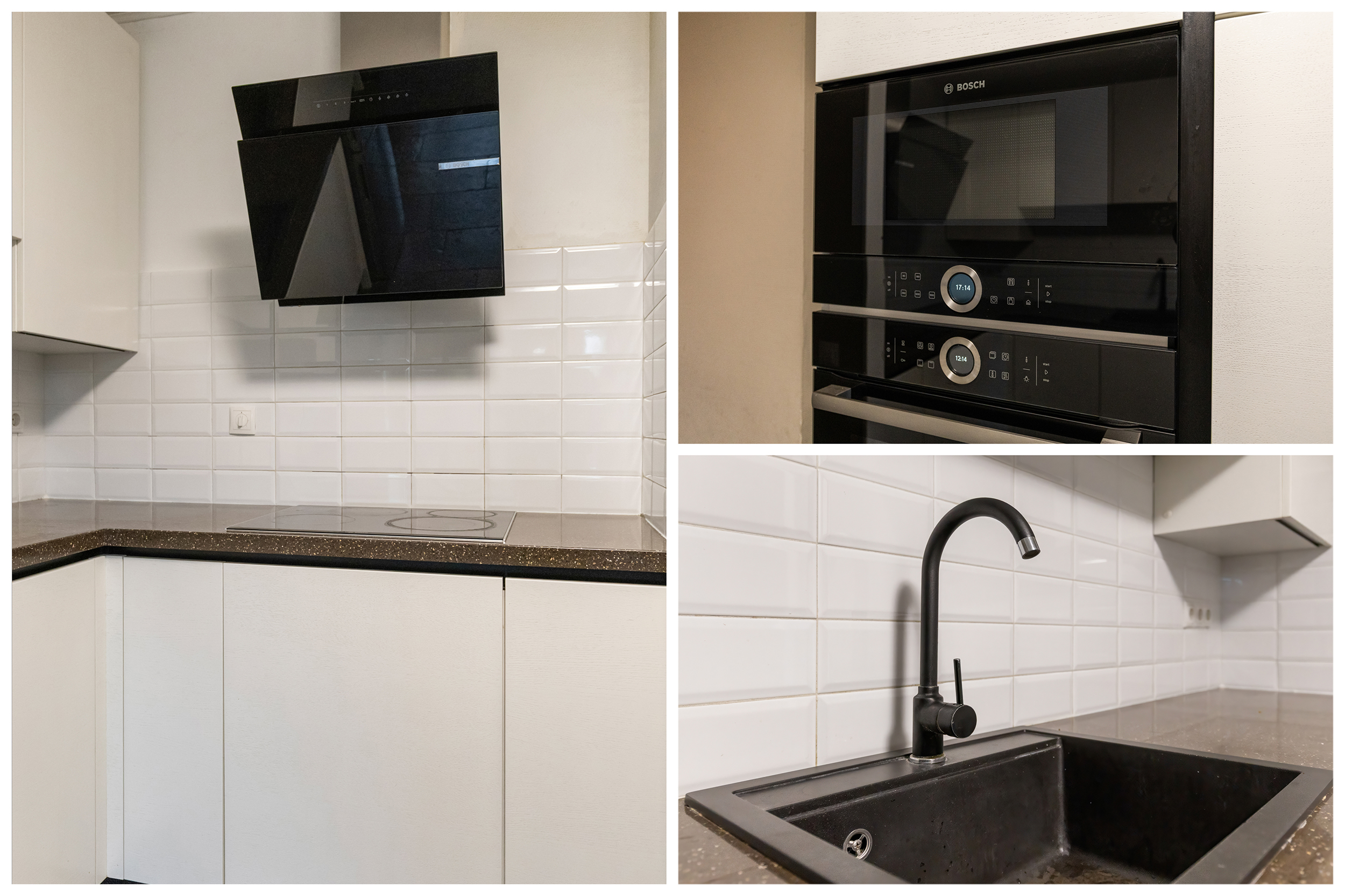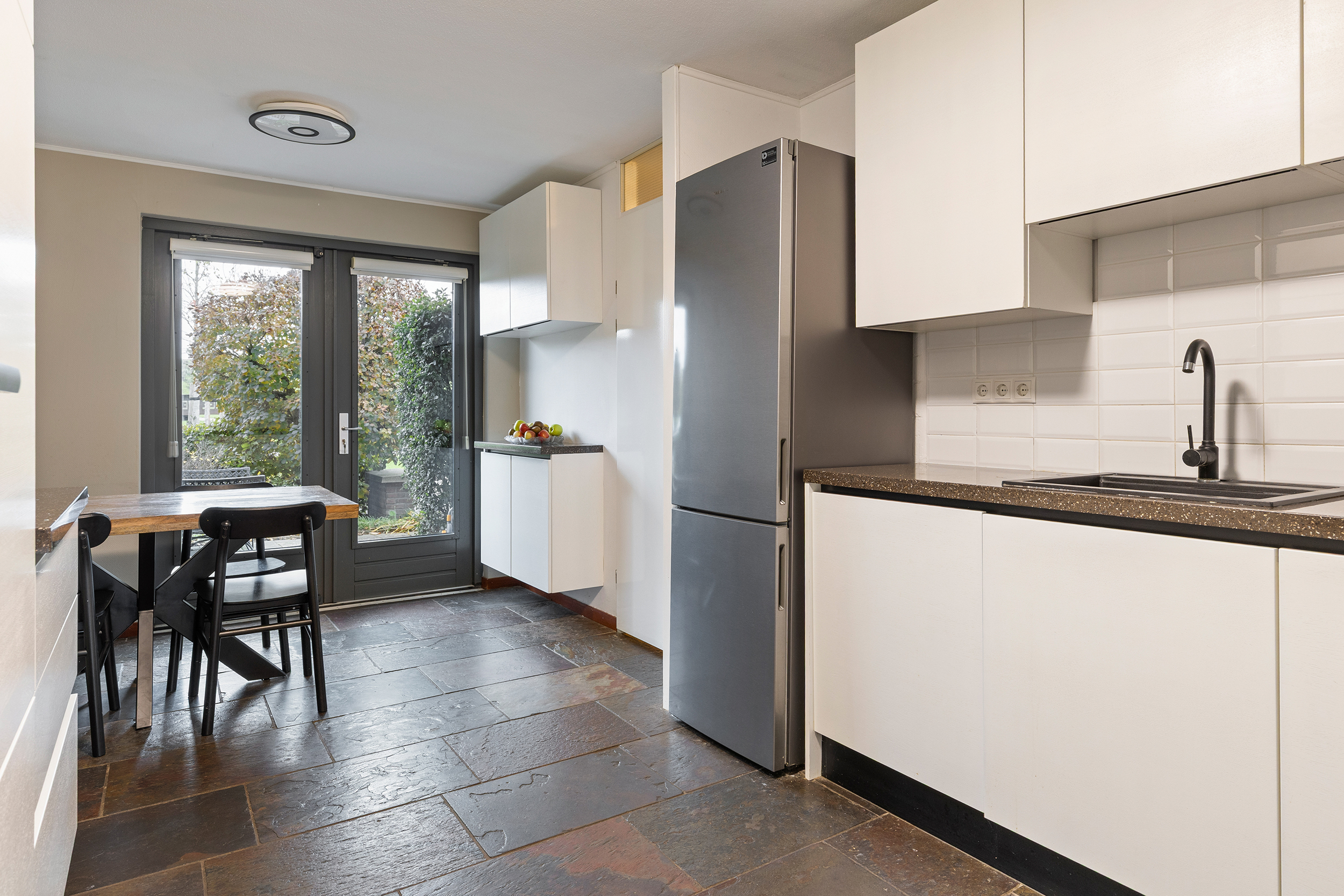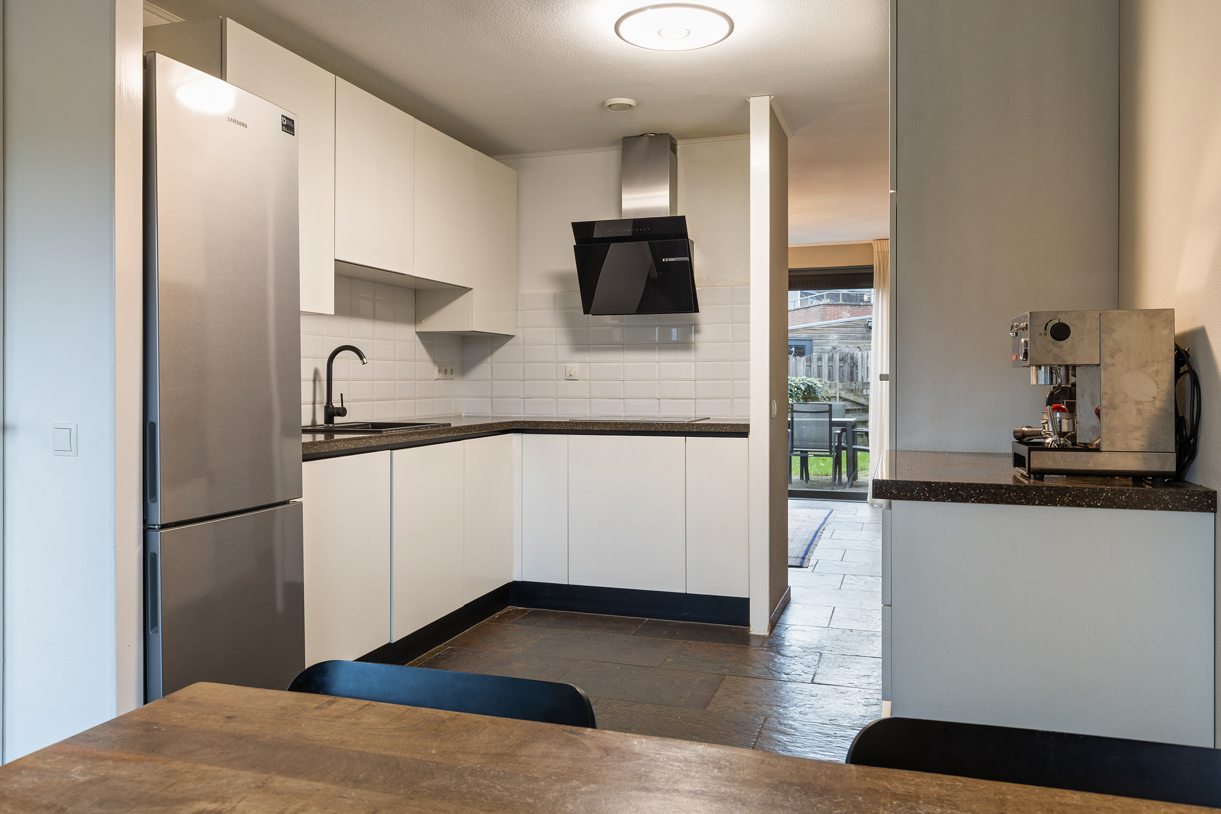 De keuken (vernieuwd in 2022) is modern en praktisch ingericht, met strakke witte fronten, een donker werkblad en volop bergruimte. De keuken is uitgerust met diverse inbouwapparatuur, waaronder een inductiekookplaat, afzuigkap, oven, magnetron, koel-vriescombinatie en vaatwasser. Dankzij de deur naar de voortuin valt er veel daglicht binnen en is er een prettig contact met buiten. Er is bovendien genoeg ruimte voor een eettafel, wat deze keuken tot een aangename en functionele leefruimte maakt.