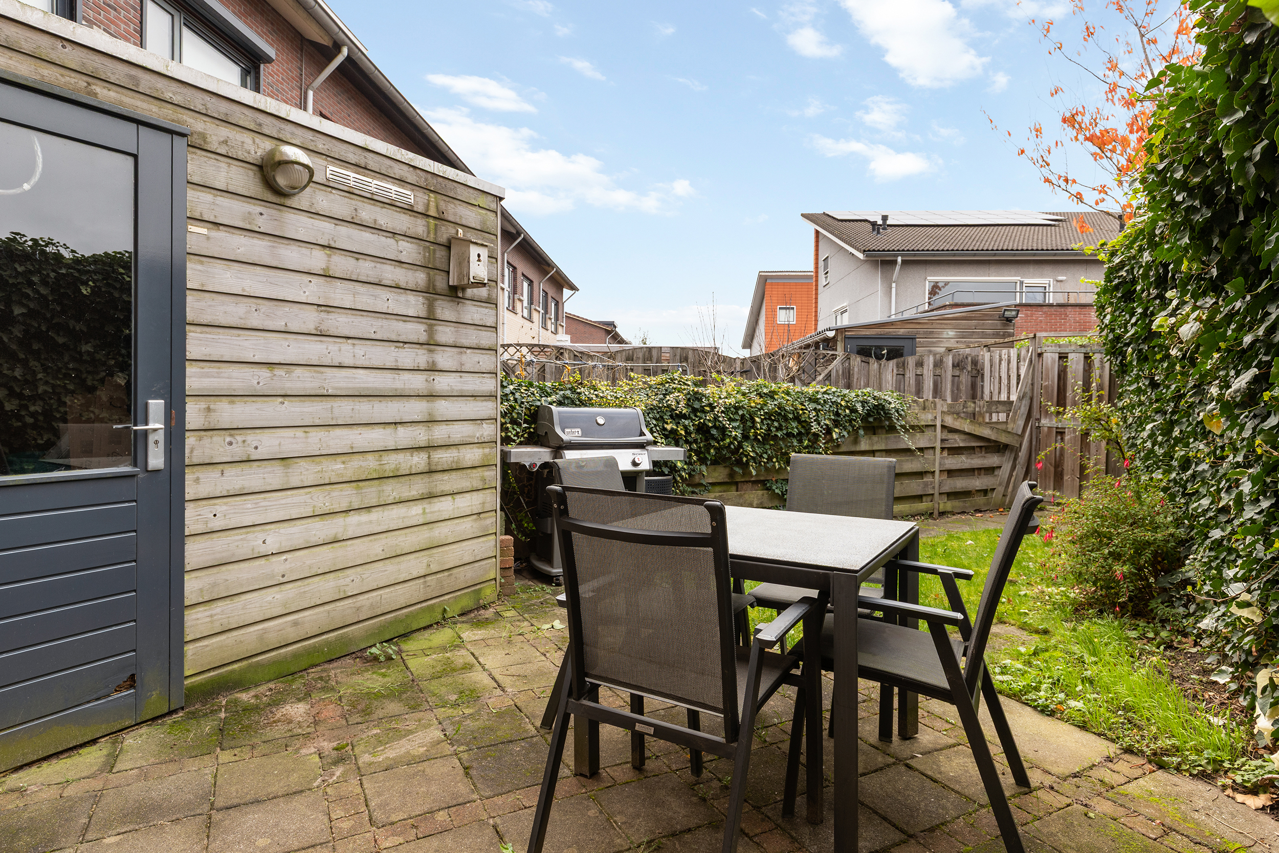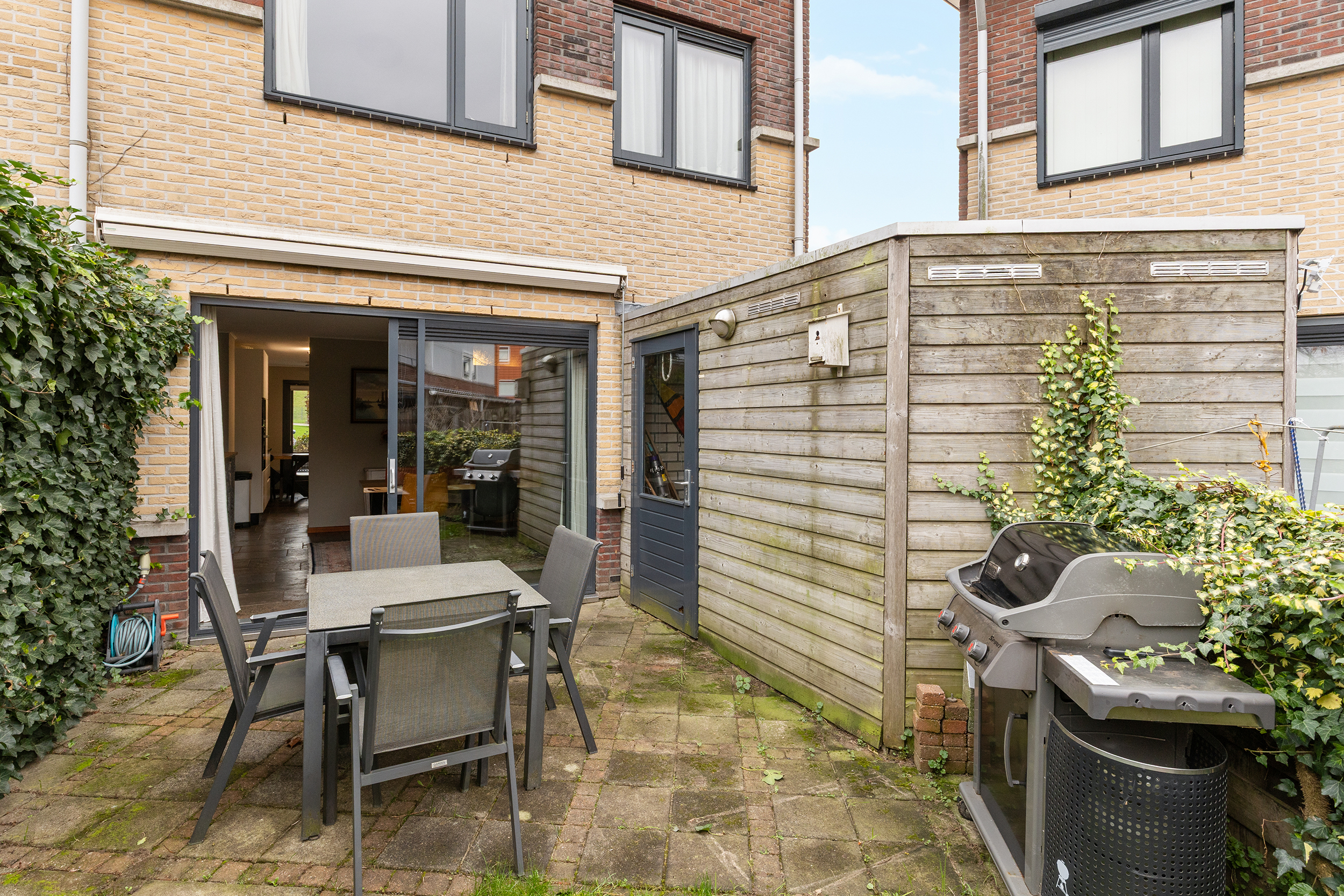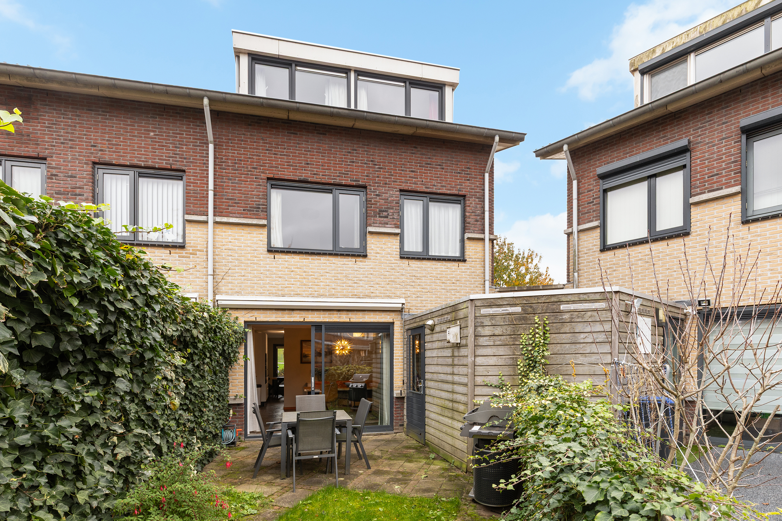 De woning beschikt over twee fijne buitenruimtes met samen circa 97 m² aan tuinoppervlakte. Aan de achterzijde ligt een zonnige tuin op het westen met achterom, waar je vanaf de middag tot in de avond heerlijk van de zon kunt genieten. Hier is voldoende ruimte voor een eettafel en loungehoek, en in de aangebouwde berging is plek voor fietsen en tuingereedschap.