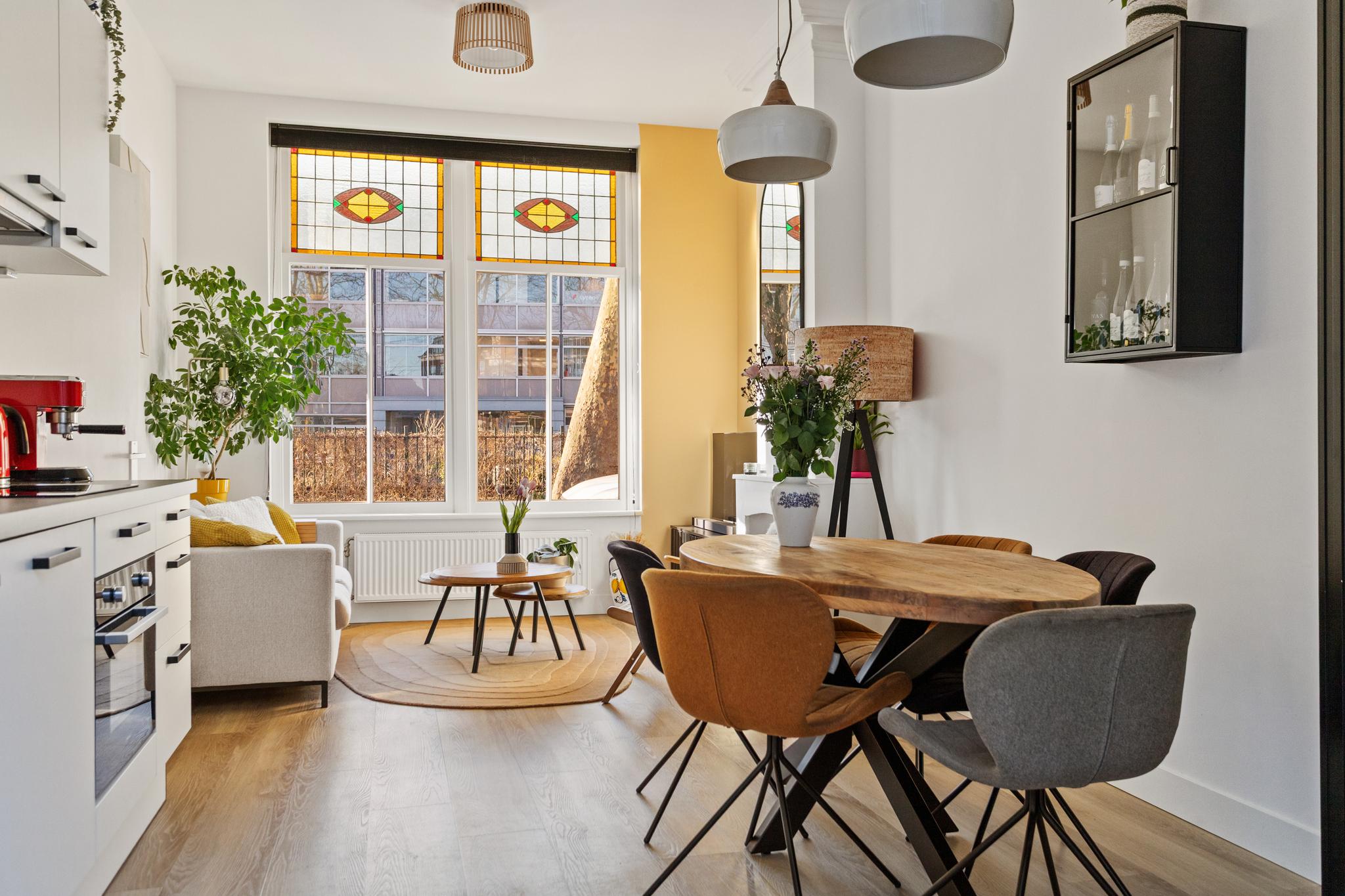 Aan je linkerhand bevindt zich de royale woon-/eetkamer met open keuken. Ook hier trekken de prachtige details, zoals de glas-in-loodramen en de authentieke schouw, meteen de aandacht. De ruimte is aan beide zijden voorzien van grote raampartijen, wat in combinatie met de hoge plafonds van ca. 3,12 meter zorgt voor een extra ruimtelijk gevoel. Er is volop plek voor een gezellige zithoek en een grote eettafel om te genieten van diners of borrels met vrienden en familie.