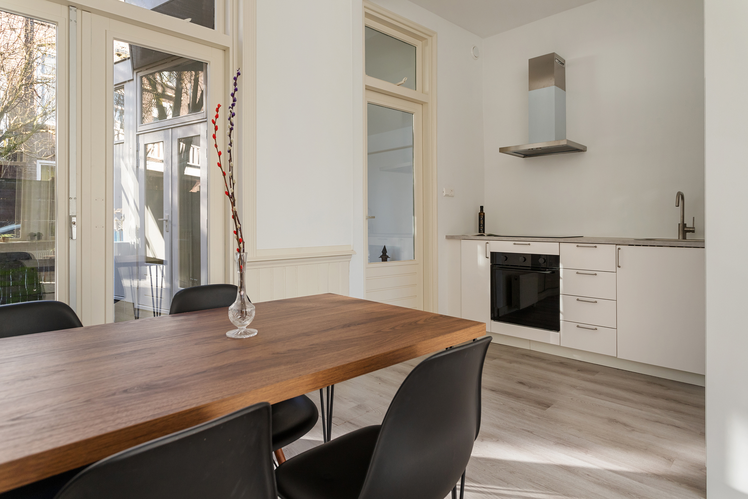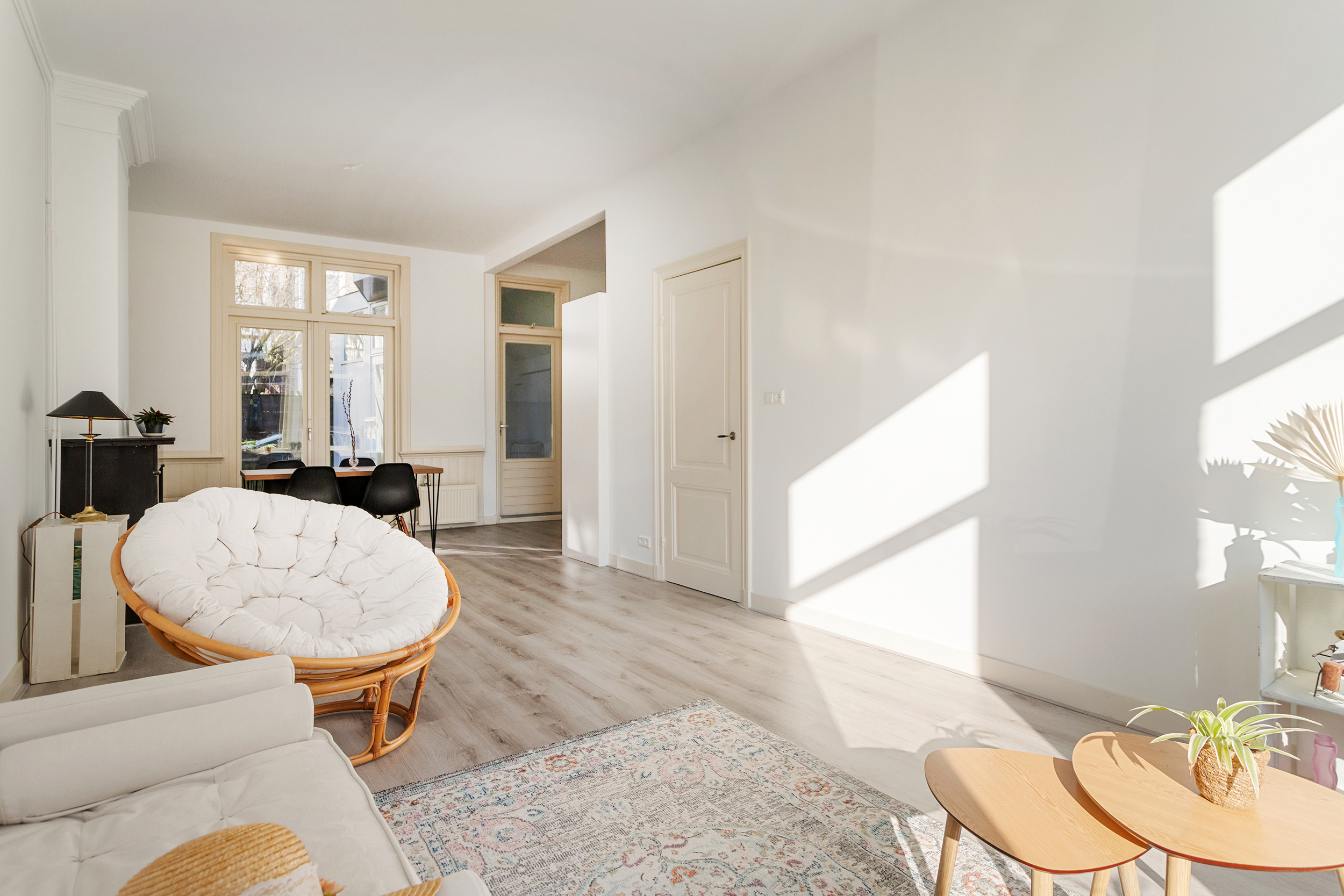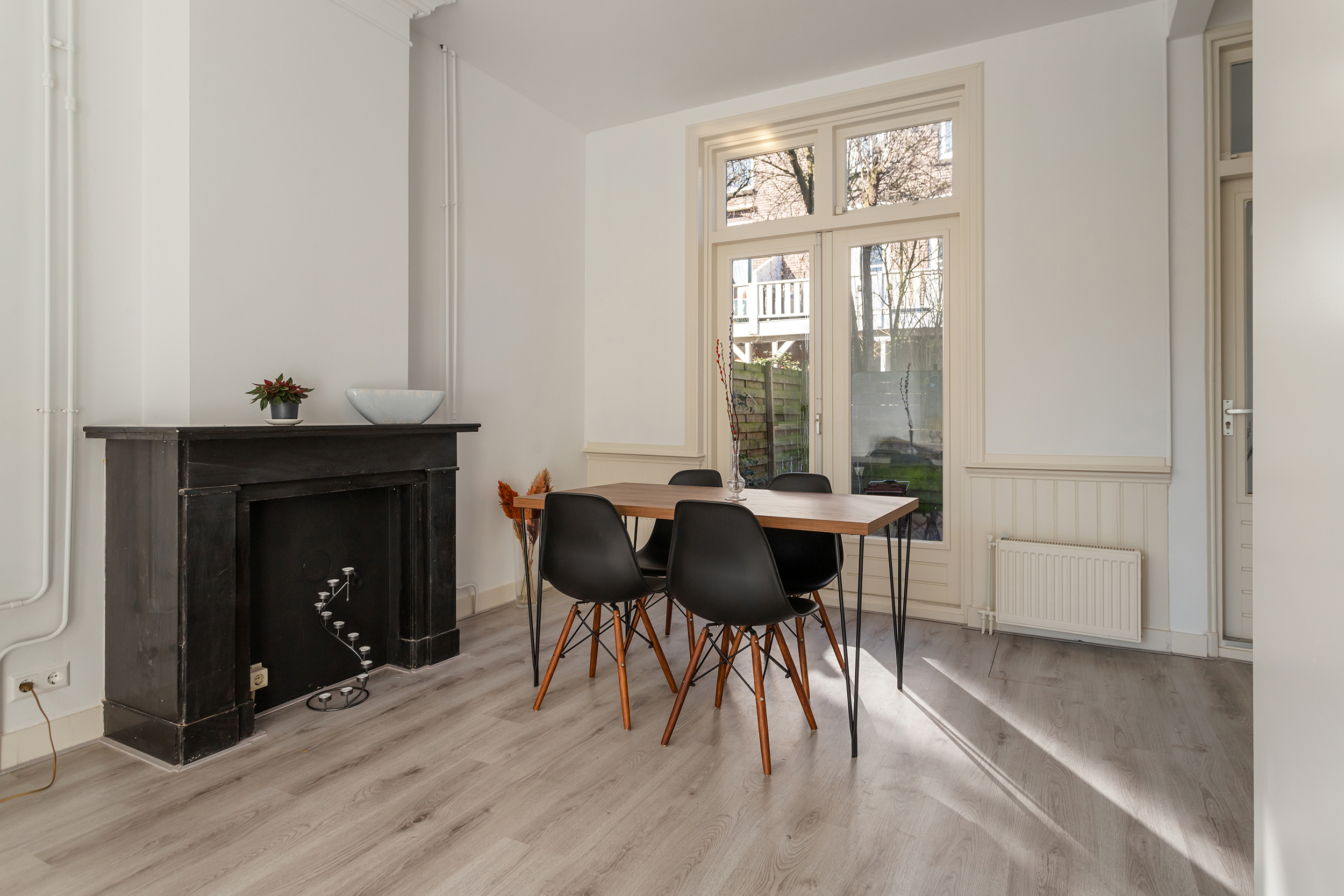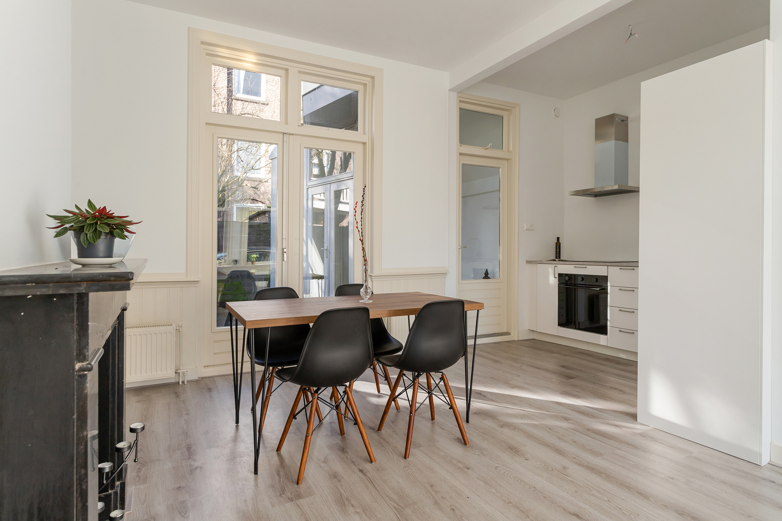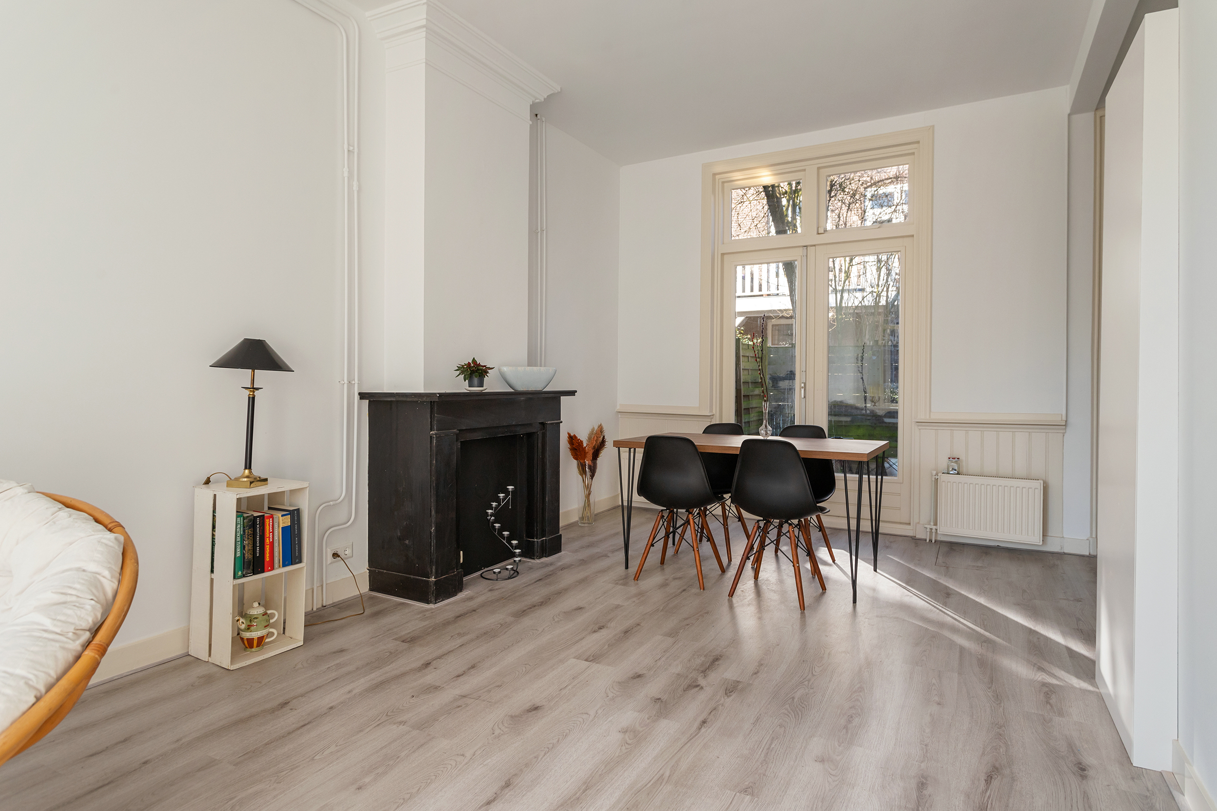 De woonkamer strekt zich uit over de volledige diepte van de woning en is een heerlijke leefruimte. Aan de voorzijde zorgen de grote raampartijen voor veel daglicht, terwijl aan de achterzijde de openslaande deuren direct verbinden met de tuin. De combinatie van de prettige lichtinval en de indrukwekkende plafondhoogte van maar liefst 3 meter geeft de ruimte een bijzonder ruimtelijk en luchtig karakter. In het midden van de kamer vormt de authentieke schouw een charmant middelpunt dat warmte en karakter toevoegt. Er is volop plek voor een comfortabele zithoek én een grote eettafel waar je uitgebreid kunt dineren of borrelen met vrienden en familie. Op zonnige dagen zet je de openslaande deuren open en vloeien binnen en buiten moeiteloos in elkaar over.