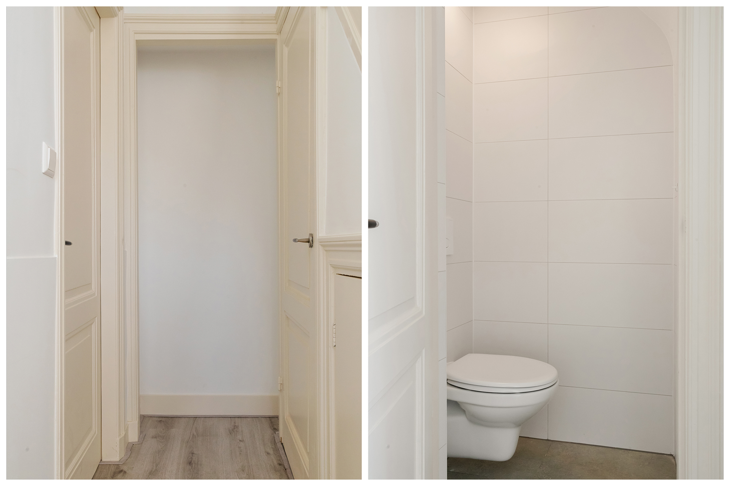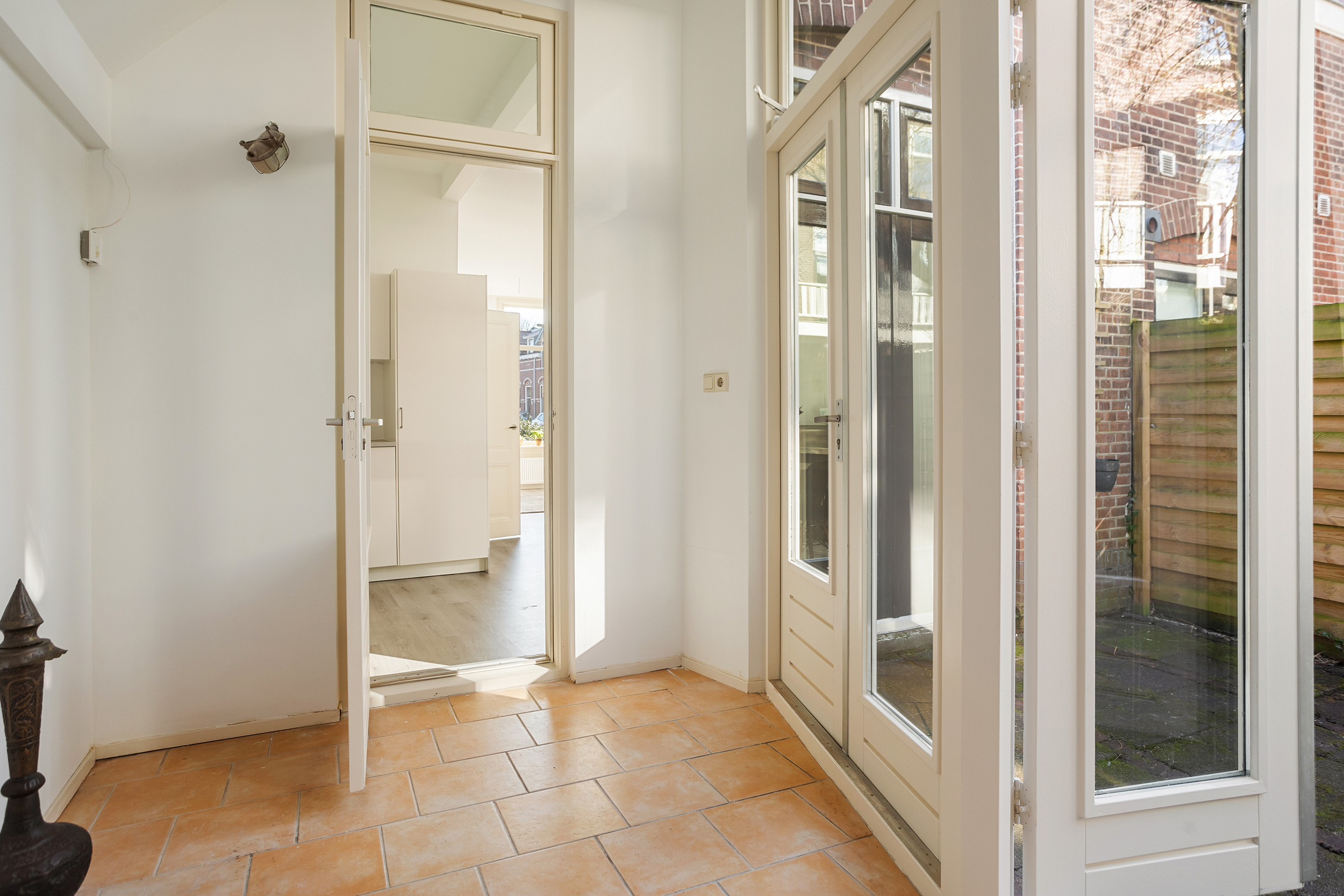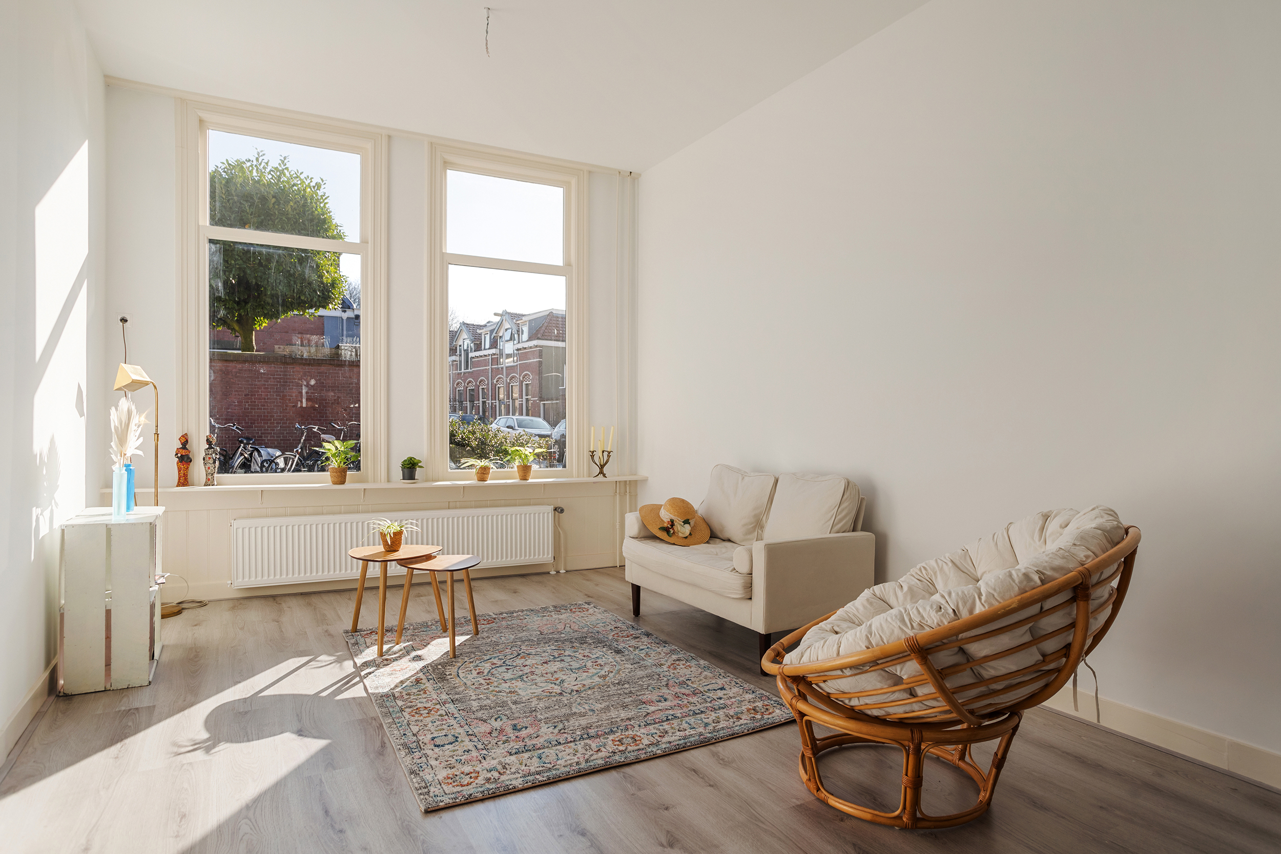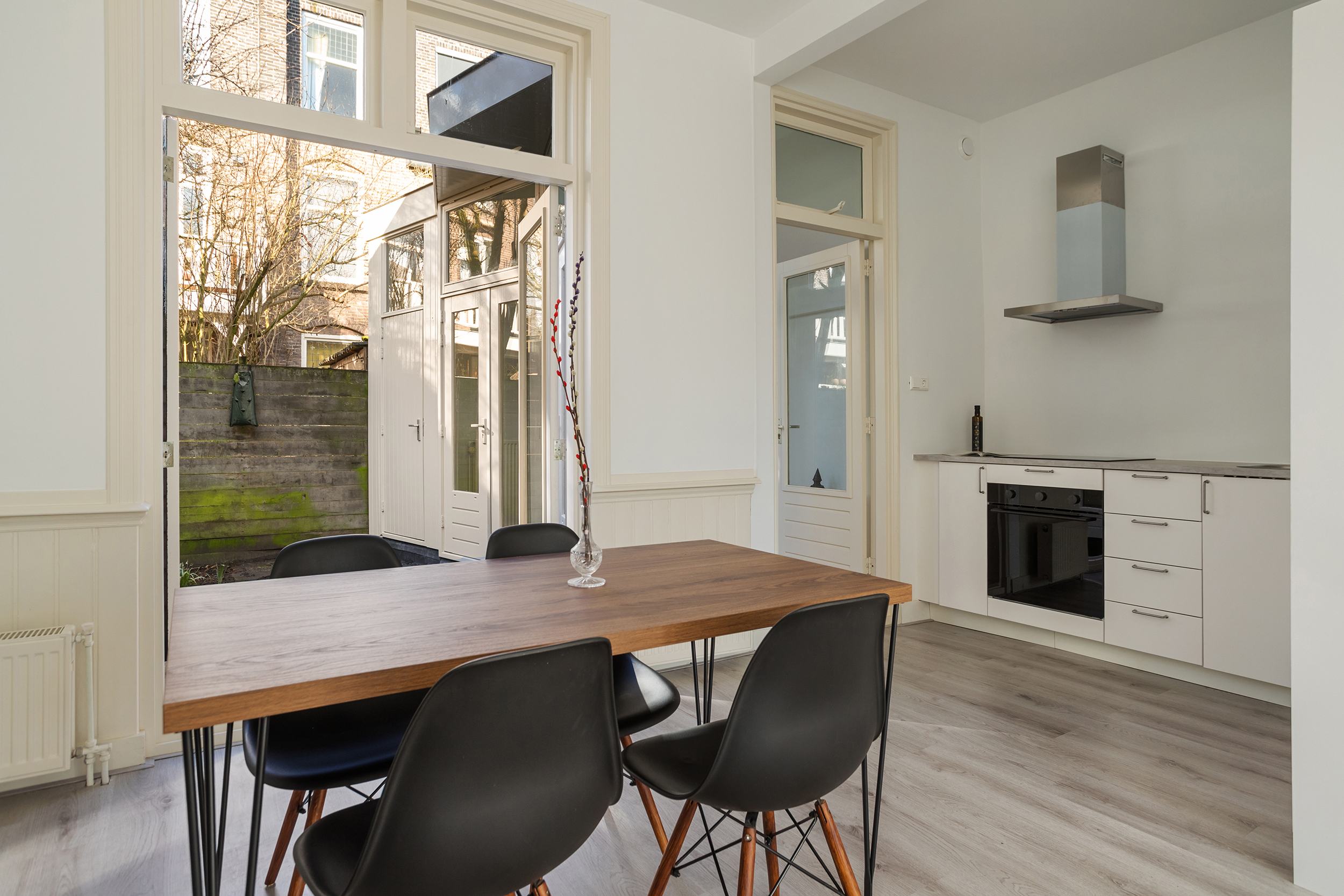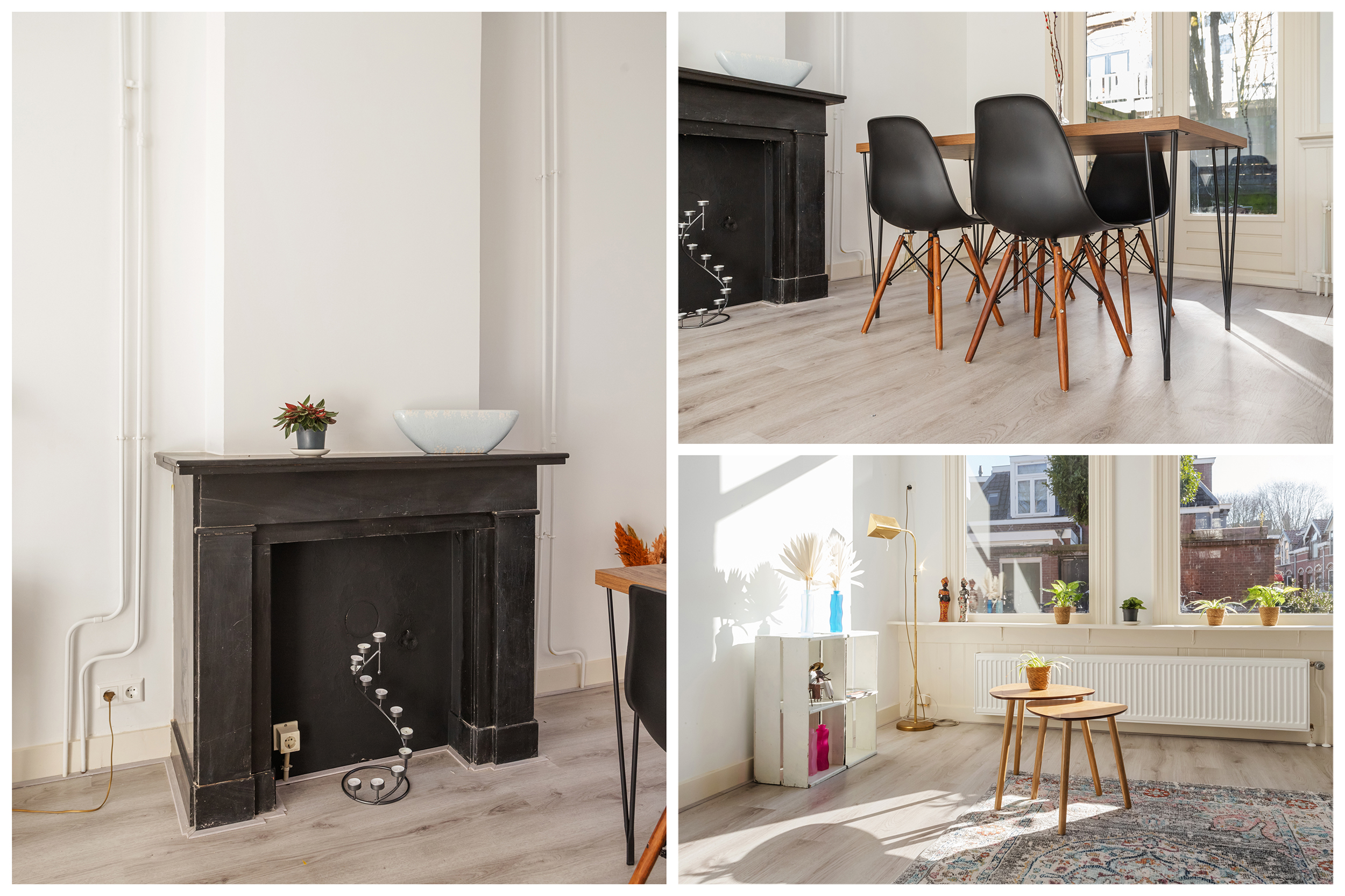 De woonkamer strekt zich uit over de volledige diepte van de woning en is een heerlijke leefruimte. Aan de voorzijde zorgen de grote raampartijen voor veel daglicht, terwijl aan de achterzijde de openslaande deuren direct verbinden met de tuin. De combinatie van de prettige lichtinval en de indrukwekkende plafondhoogte van maar liefst 3 meter geeft de ruimte een bijzonder ruimtelijk en luchtig karakter. In het midden van de kamer vormt de authentieke schouw een charmant middelpunt dat warmte en karakter toevoegt. Er is volop plek voor een comfortabele zithoek én een grote eettafel waar je uitgebreid kunt dineren of borrelen met vrienden en familie. Op zonnige dagen zet je de openslaande deuren open en vloeien binnen en buiten moeiteloos in elkaar over.