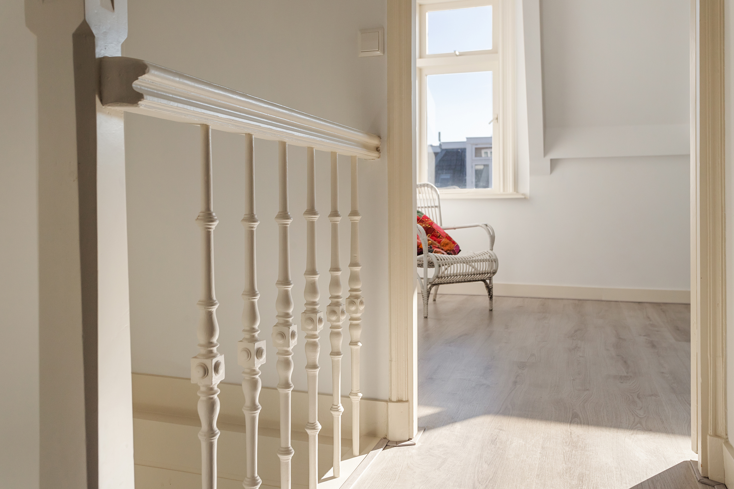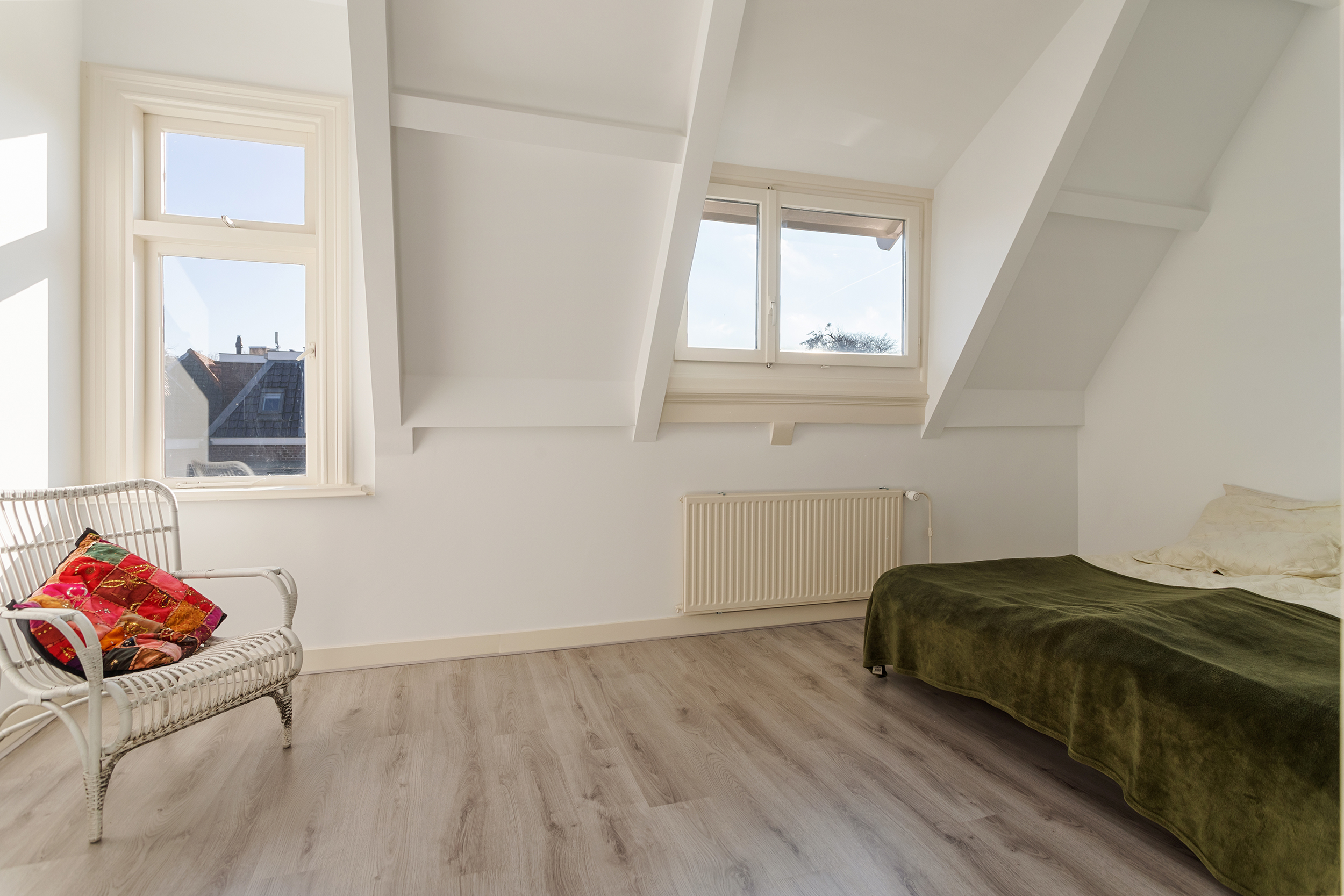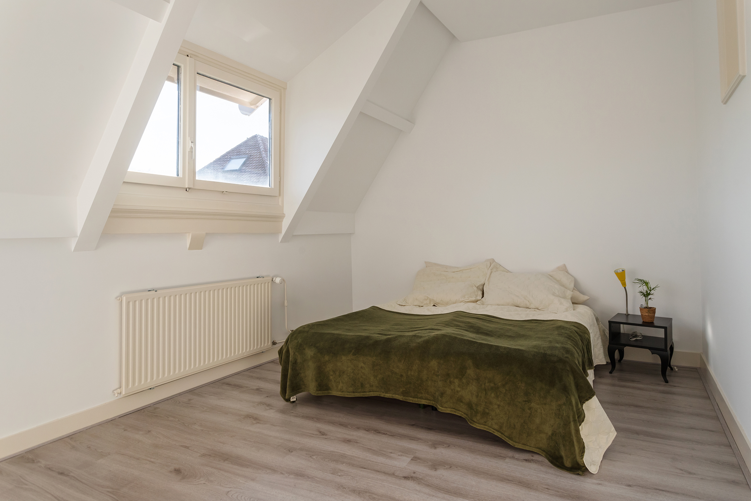 De overloop geeft toegang tot twee ruime slaapkamers en de badkamer. Beide kamers zijn prettig licht en bieden volop ruimte voor een comfortabel tweepersoonsbed en een grote kastenwand.