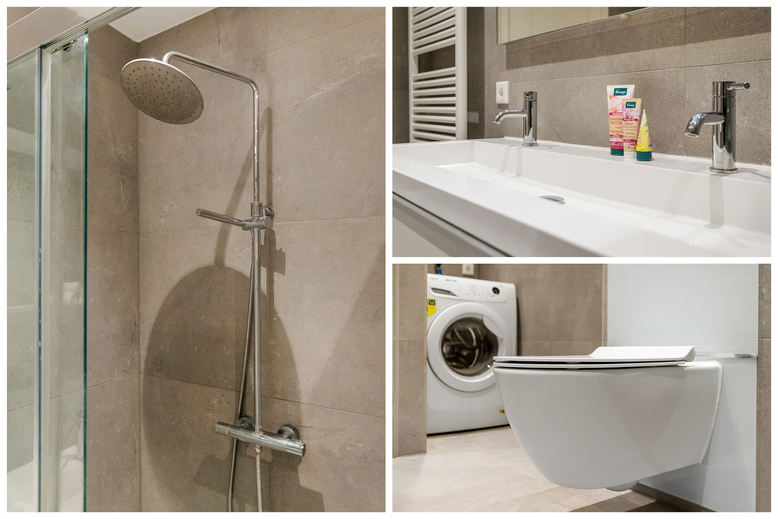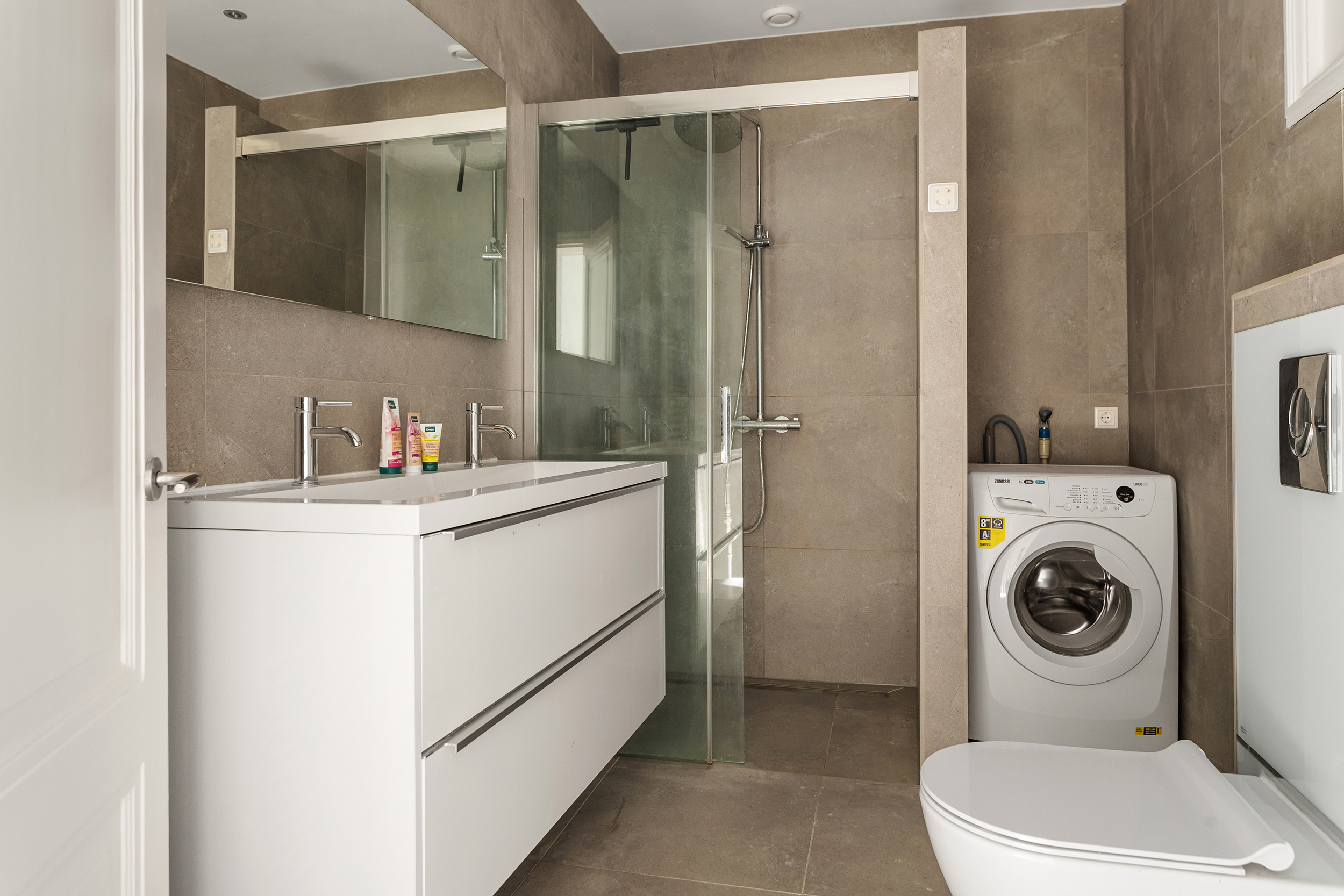 De luxe badkamer is recent vernieuwd en modern uitgevoerd. Je vindt hier een ruime inloopdouche, een dubbele wastafel met meubel, een toilet en de aansluiting voor de wasmachine.