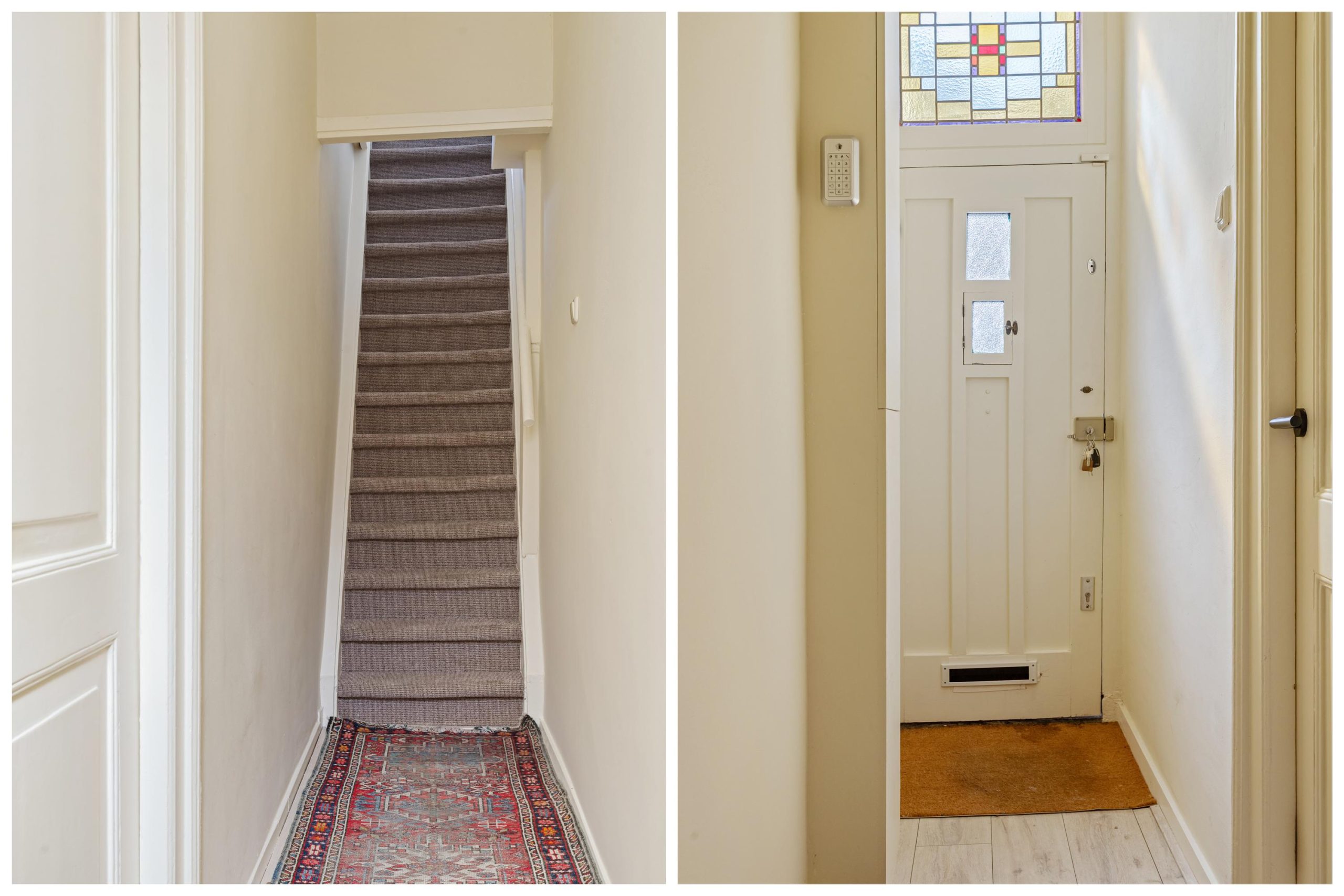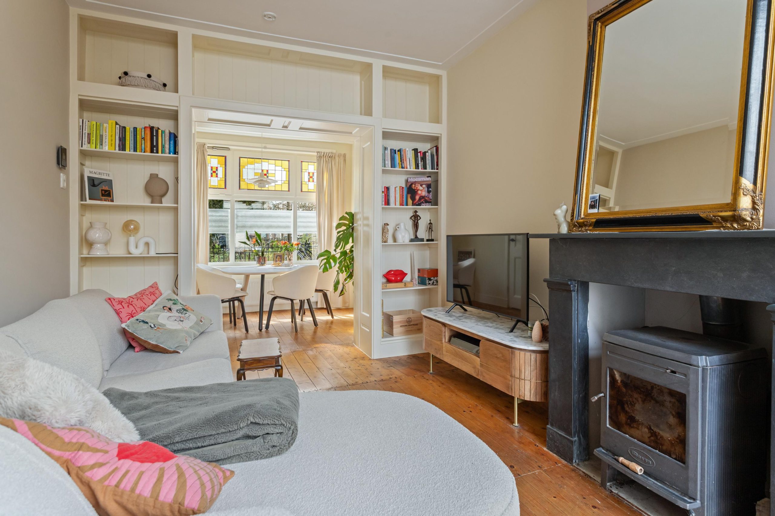 De sfeer is hier vanaf het eerste moment voelbaar. Authentieke details zoals prachtige glas-in-loodramen, warme houten vloeren, een werkende haard met karaktervolle schouw en originele en-suite kasten geven de woning karakter en warmte. De leefruimte is heerlijk licht en vormt een fijne plek om thuis te komen, met openslaande deuren die zorgen voor een directe verbinding met de ruime tuin.