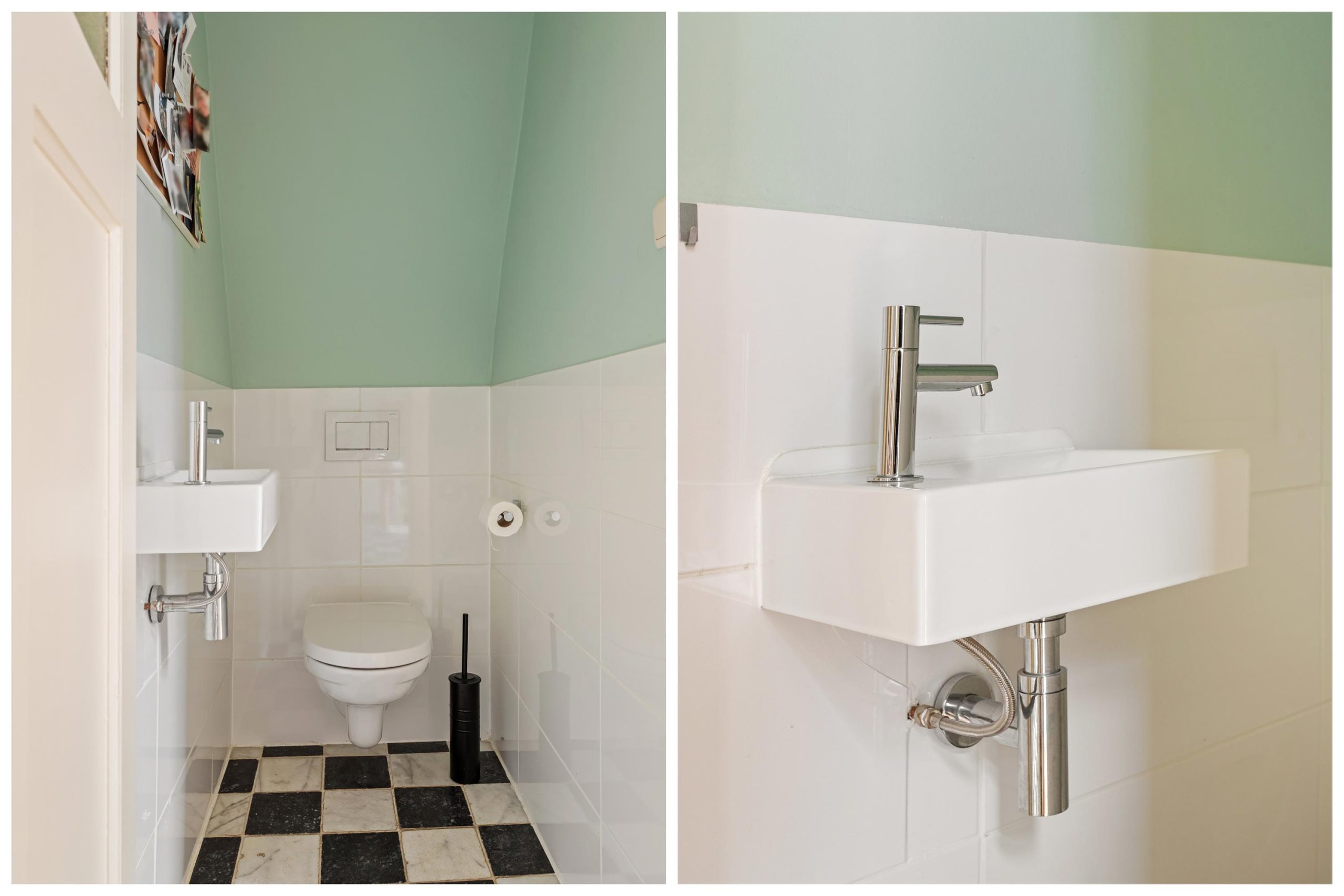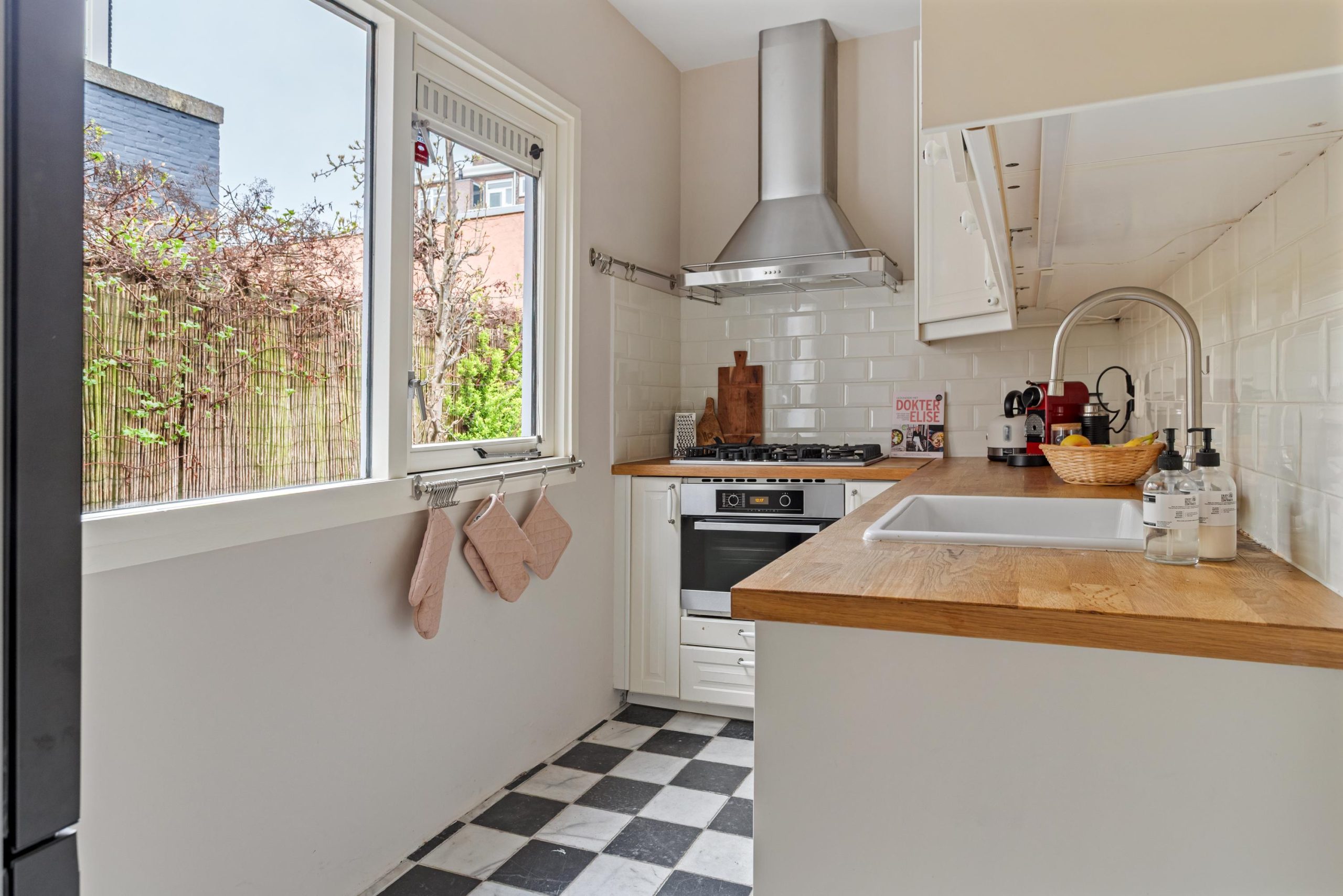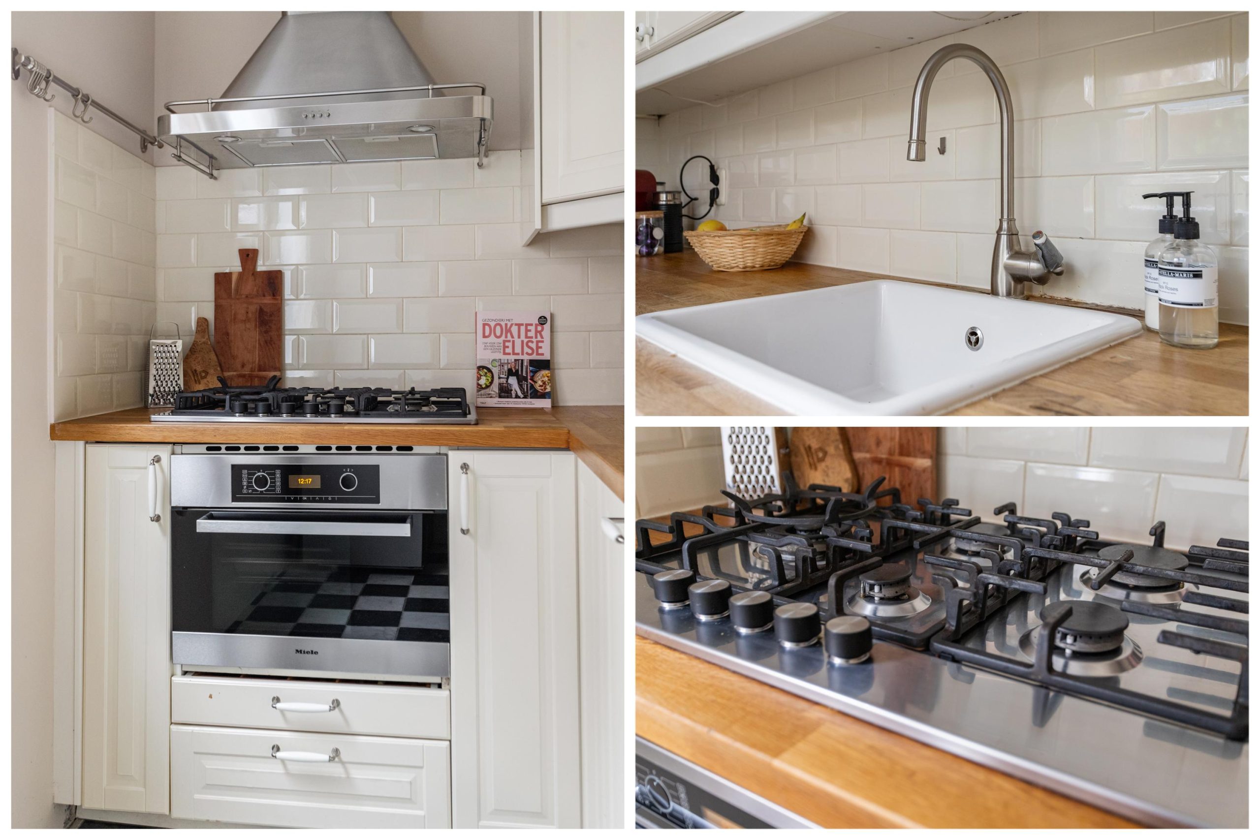 Vanuit de woonkamer loop je door naar de keuken aan de achterzijde. De keuken is charmant en sluit perfect aan bij het karakter van de woning en is voorzien van alle benodigde (inbouw)apparatuur. Het raam zorgt hier voor prettig daglicht en zicht op de tuin.