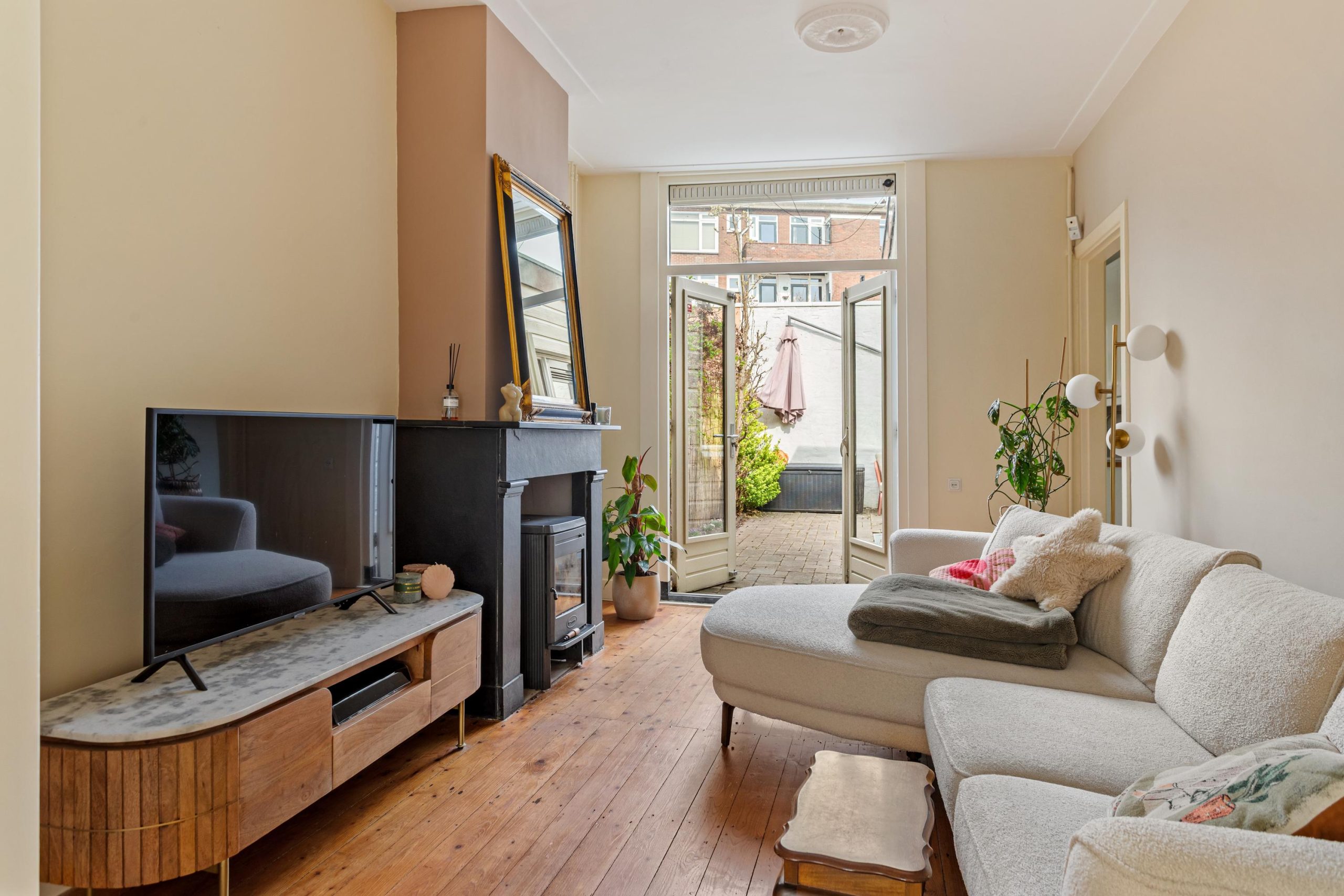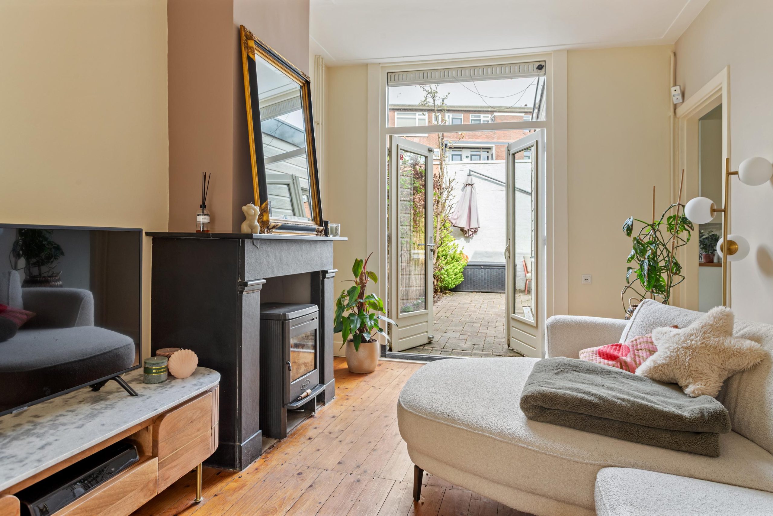 De woonkamer is een fijne, sfeervolle ruimte waar direct de warme houten vloeren en de authentieke details opvallen. De haard met schouw vormt een mooi middelpunt en geeft de ruimte extra karakter. Aan de achterzijde zorgen de openslaande deuren voor veel licht en een prettige verbinding met de tuin.