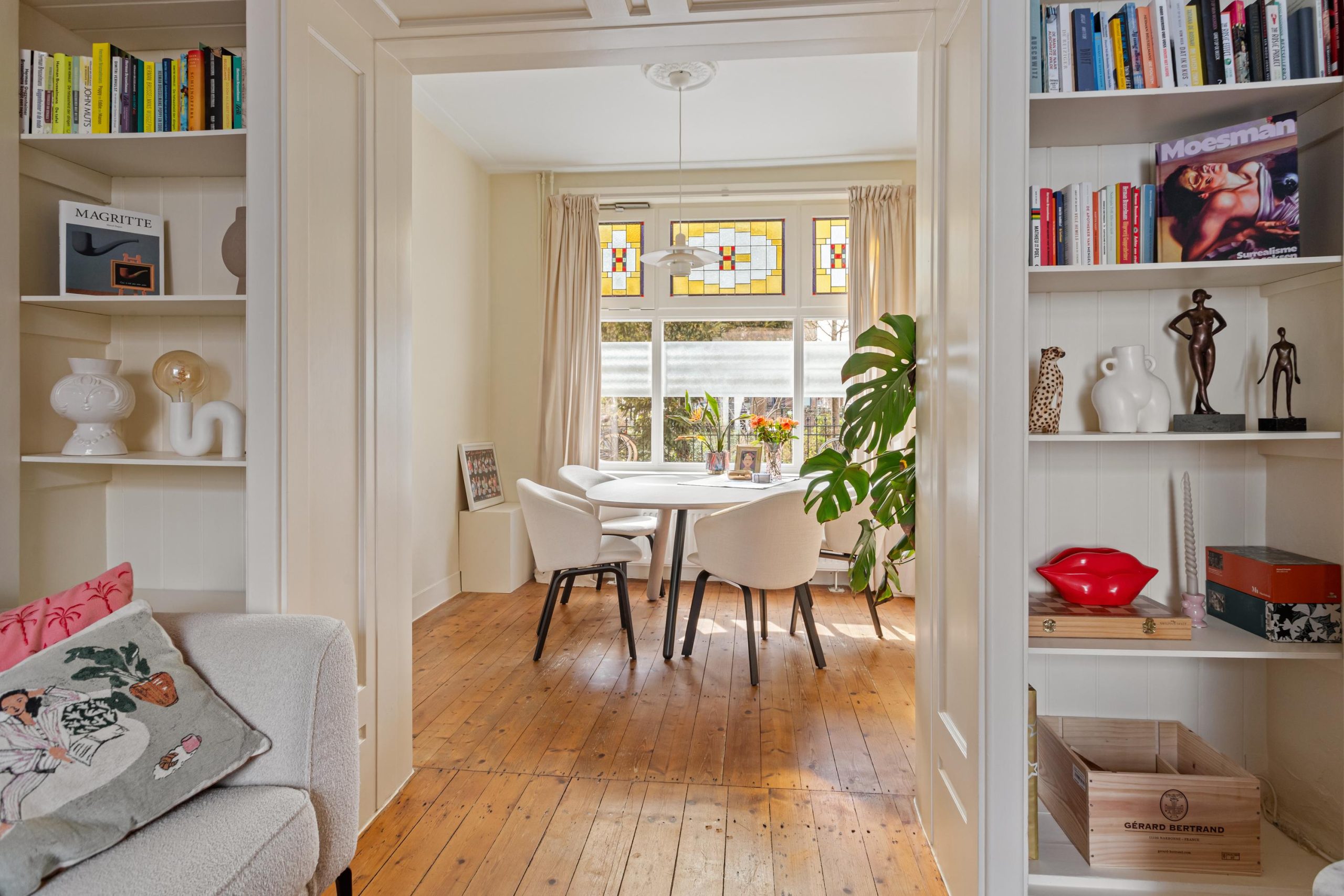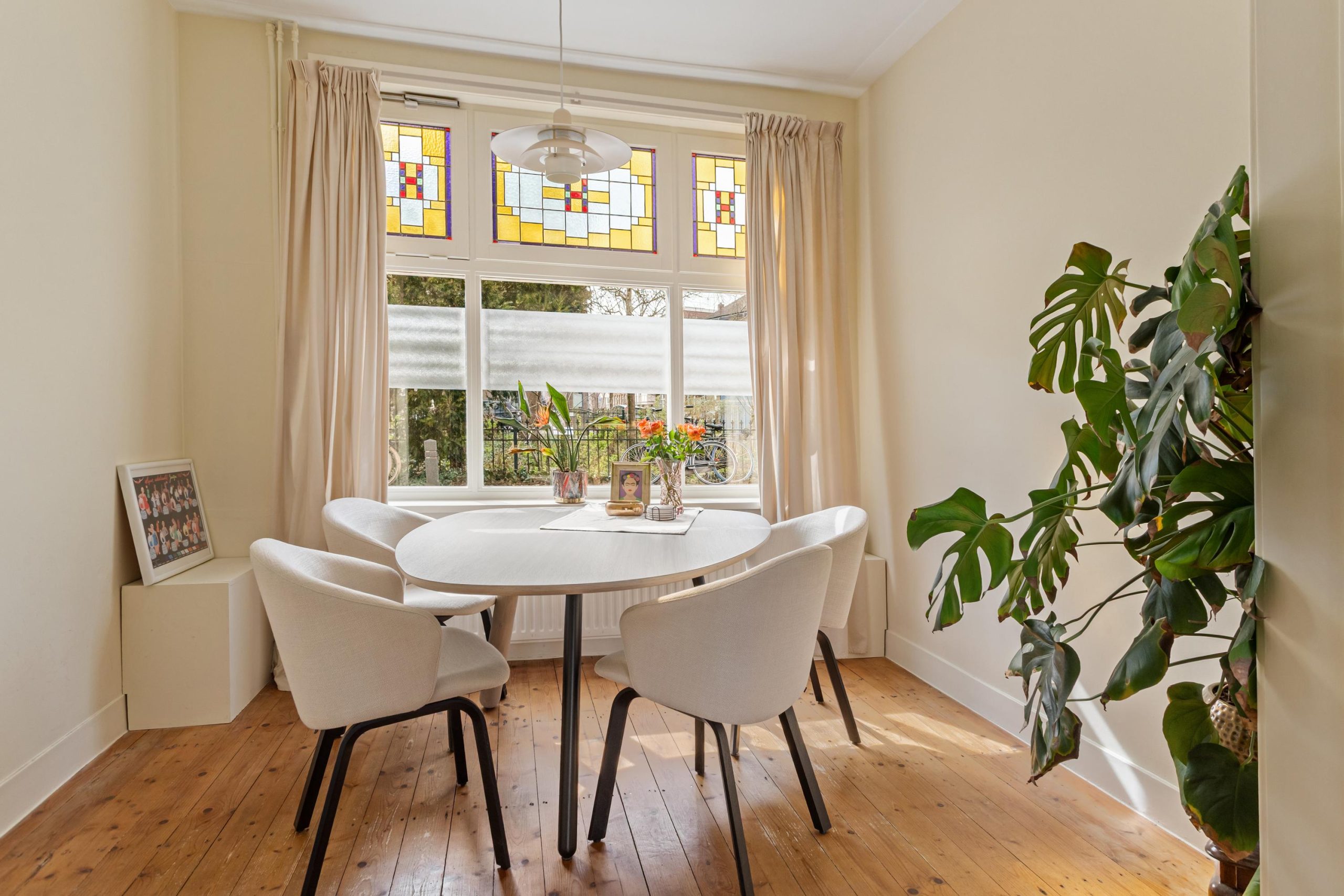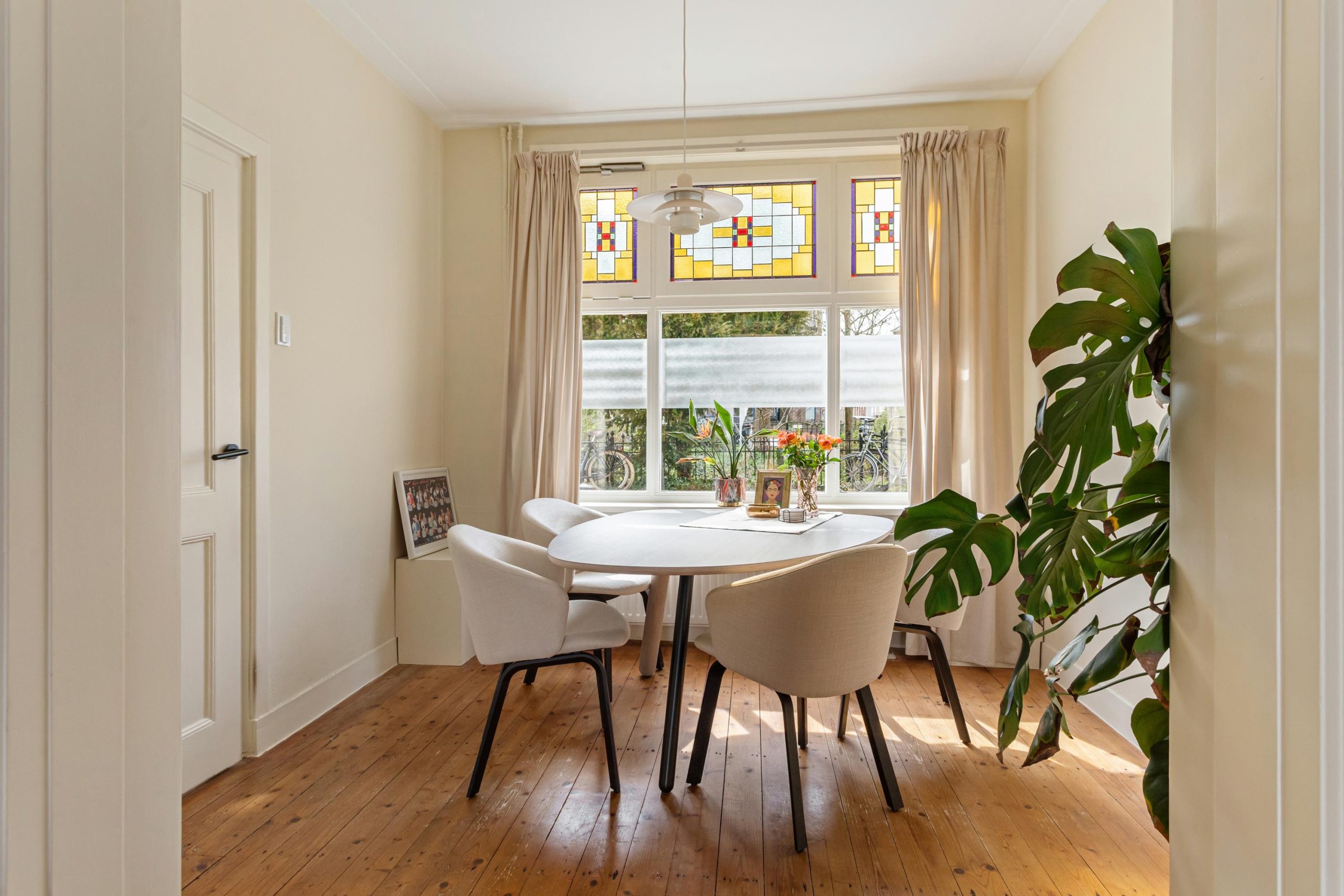 Aan de voorzijde bevindt zich de eetkamer, afgescheiden door de originele en-suite met vaste kasten. Een charmante plek met prachtige glas-in-loodramen, waar het licht op een mooie manier naar binnen valt en de sfeer van de woning volledig tot zijn recht komt. Er is hier alle ruimte voor een grote eettafel, perfect voor lange, gezellige avonden met vrienden en familie.