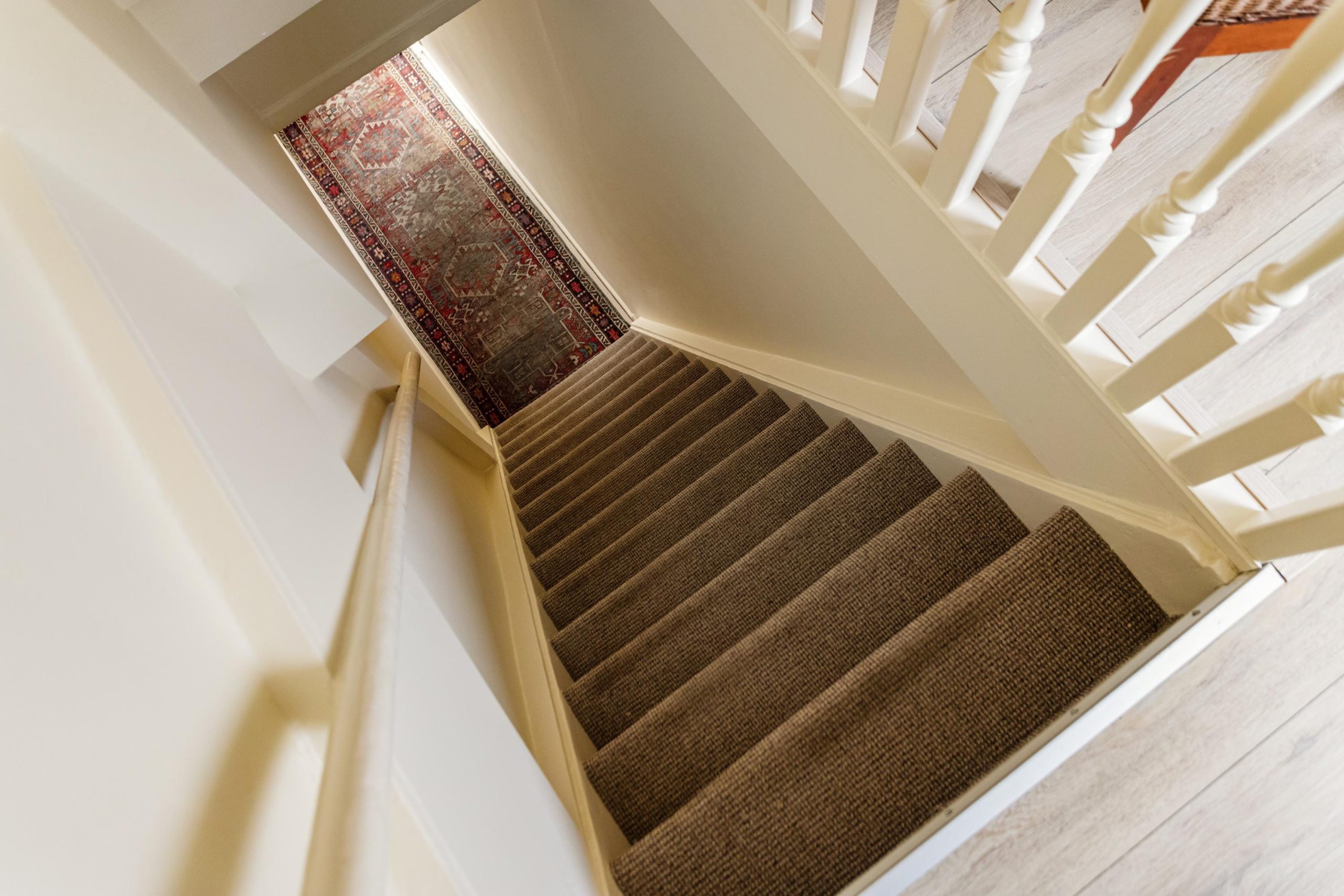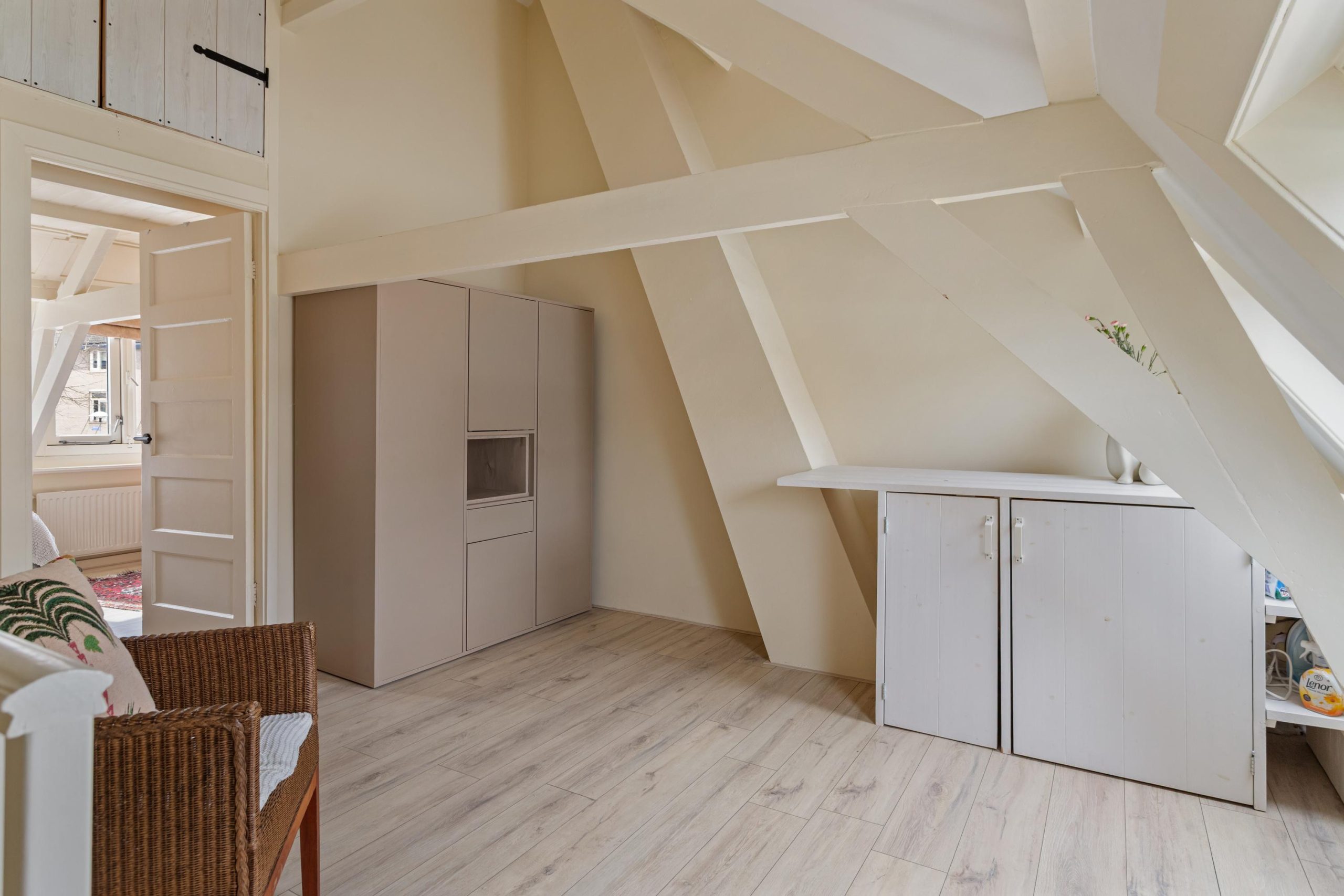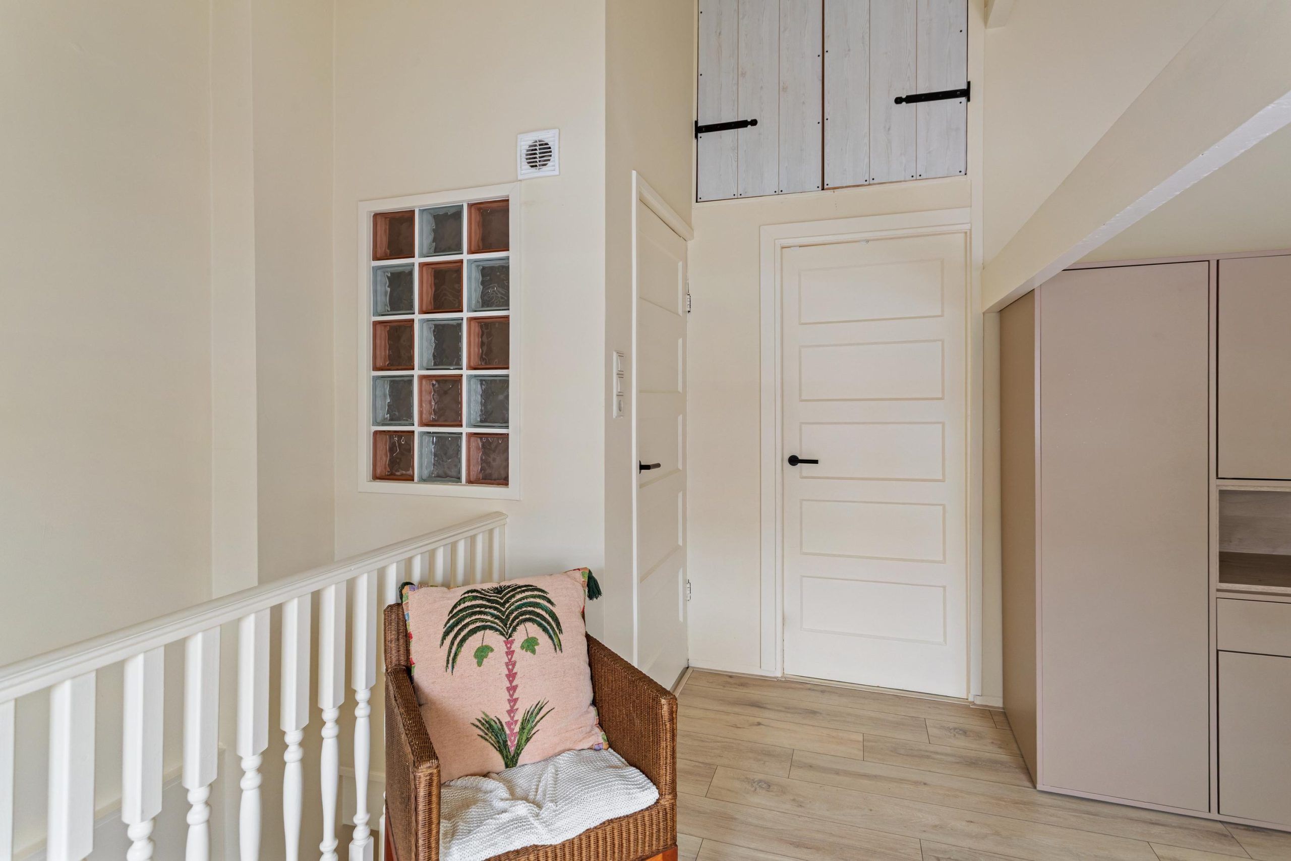 Via de trap bereik je de eerste verdieping, waar je binnenkomt in een ruime kamer aan de voorzijde. Wat hier meteen opvalt is het vele licht, de zichtbare balken en de indrukwekkend hoge nok. Deze kamer is flexibel in te richten, bijvoorbeeld als werkplek, kleedruimte of extra slaapkamer.