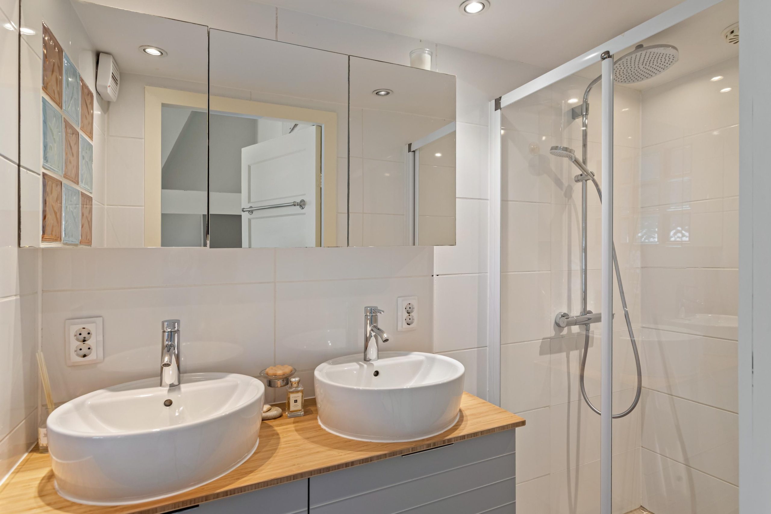 De badkamer is vanuit de voorste kamer bereikbaar en is voorzien van een douche en dubbele wastafel met meubel.
